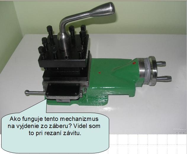 Je v tom pomocné rybinové lože, pružiny, které to odtlačují a vačka na páce. Na SV 18 dáš na to jednu ruku, druhou na pohonou páku a jedeš závit, na konci řezanýho závitu to ve výběhu překlopíš do odtažené polohy současně s reverzováním otáček. Přidáš si na další třísku a tak pořád dokola. Když to dělá, kdo to umí je to koncert.