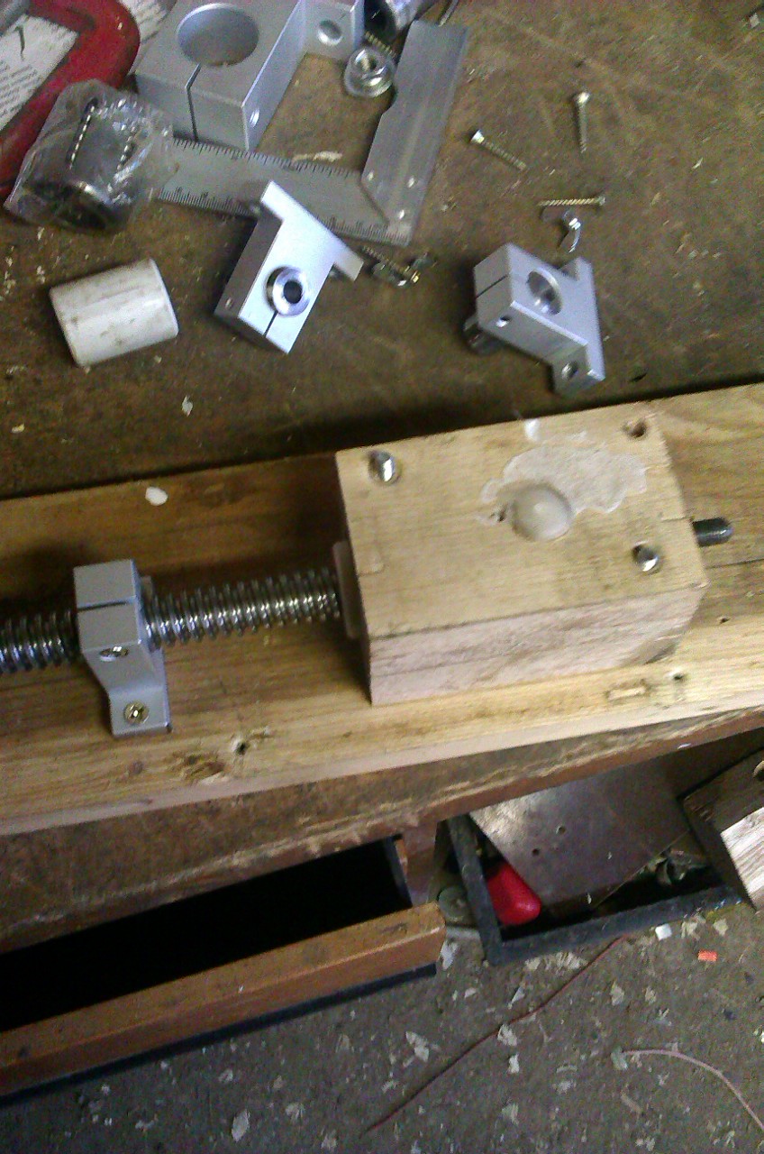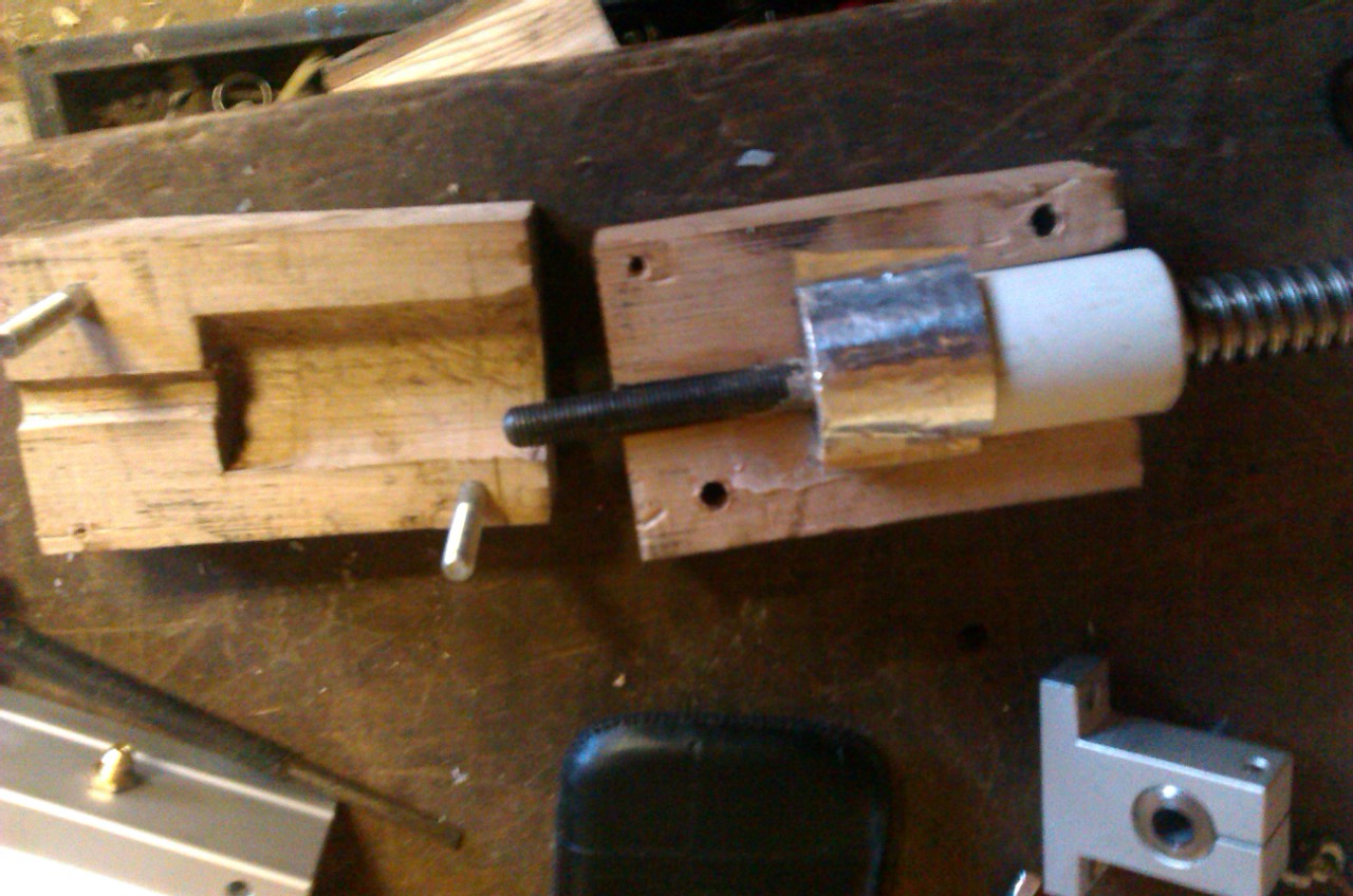 Keďže neoplývam bohatstvom riešim to dostupnými prostriedkami. Mám sice trapez ale spôsob použitia môže byť rovnaky. Najskôr som si urobil pripravok na presné vyosenie šrub a hriadel priemer 8 mm. Celé som to zafixoval v prípravku . Koniec trapezu som zasunul do drevenej formy a z druheho konca som zasunul hriadel . Do hriadelky ako aj do trapezu som urobil zárez . Celé som to zalial dentacrylom. Ako hriadelku som použil osku z predneho kolesa bicykla. Z naboja kolesa som vybral ložiskové telesa. trakže spolu s guličkami tvoria obojstranné axiálne ložisko. Týmto spôsobom sa dá presne vymedziť vôľu ložiska.