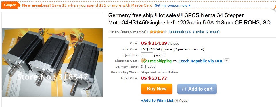 Lacnejší? z CNC shop-u jeden kus 160€ , no na ebay "ten istý" 165€ za 3 kusy . Asi si prehliadol že cena je za 3 kusy nie za jeden .oscar píše:nevim co je dobra cena, ale tady je ten motor levnejsi