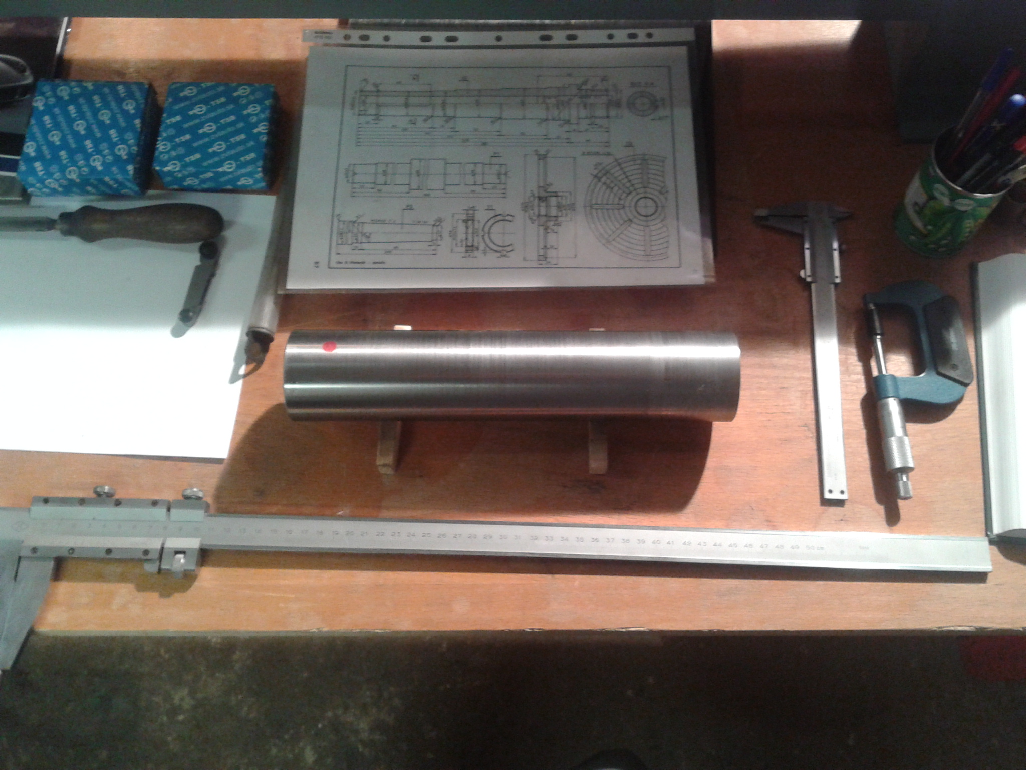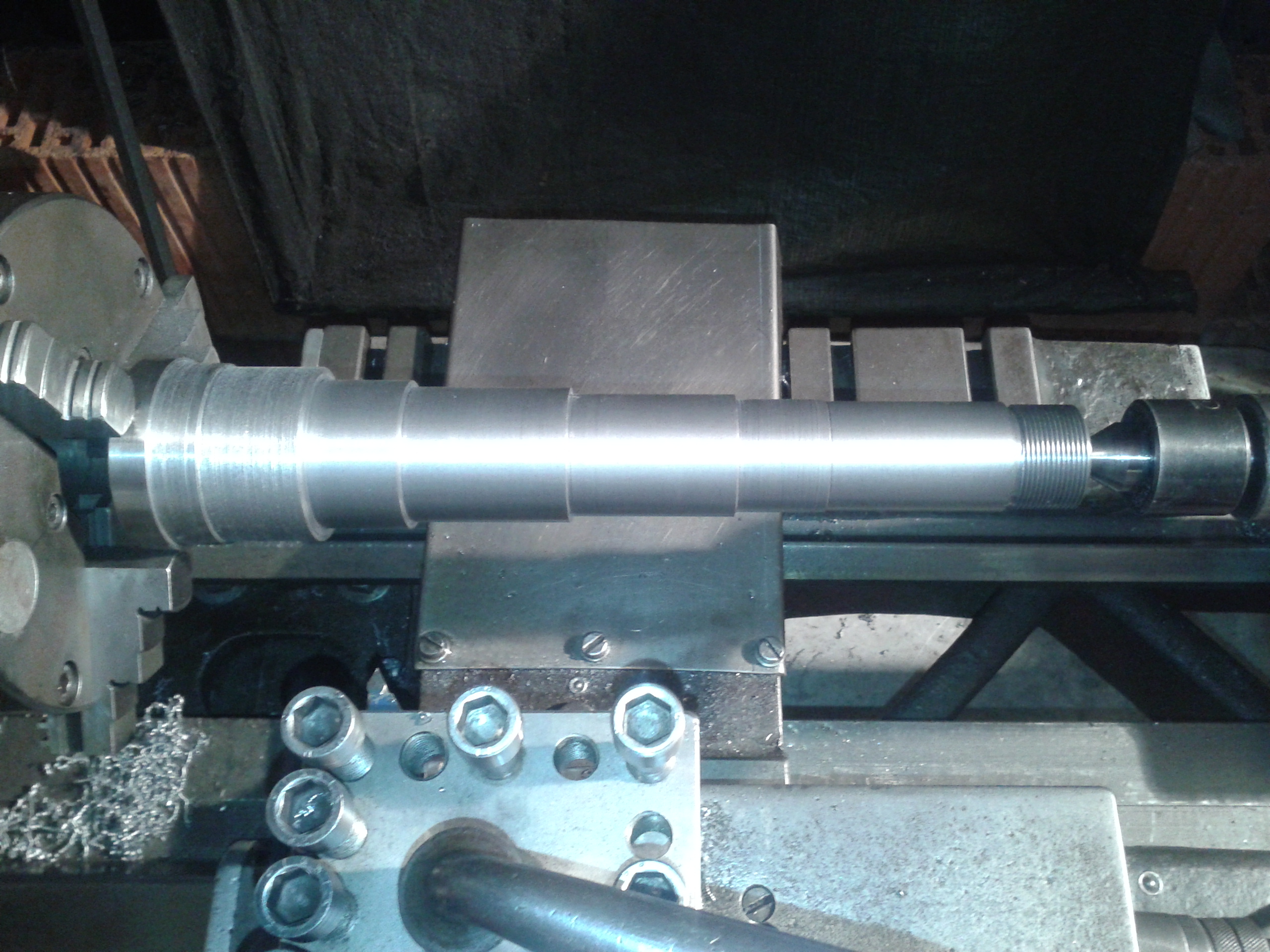 Vřeteno je v základních tvarech, s přídavkam na přesnější doladění rozměrů hotovo, jelikož soustružím bez chlazení , tak se ohřálo tak, že jsem toho raději nechal a přesnou práci udělám za studena, je to mat. 11600, zušlechťovat a brousit to nebudu, snad jen dutinu Mk3 přebrousím až na vlastním soustruhu.