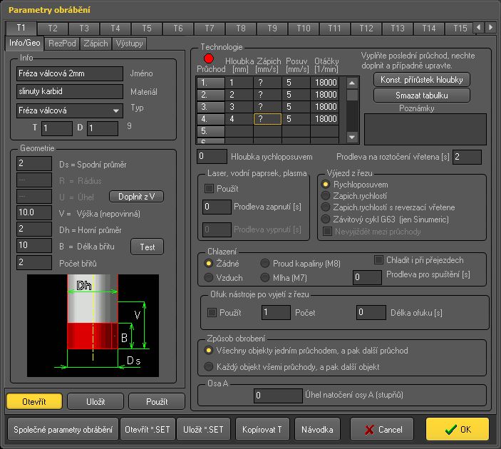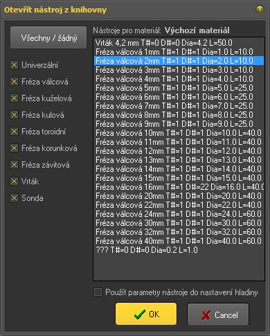 Knihovna nástrojů a materiálů, v knihovně jsou pod definicí nástroje i definice materiálu které obsahují řezné podmínky, zápichy a použití výstupů pro konkrétní materiál.
