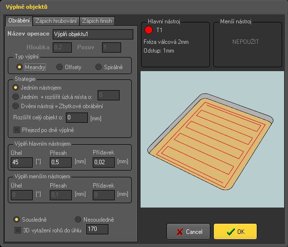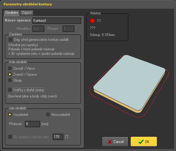 parametrický CAM, tedy obráběcí operace a jejich nastavení se ukládají, takže později cokoliv změnit v již vygenerované dráze je otázka pár kliknutí, dráha se pak automaticky regeneruje. Tedy na levé straně je nový panel kde jsou použité obráběcí operace.
