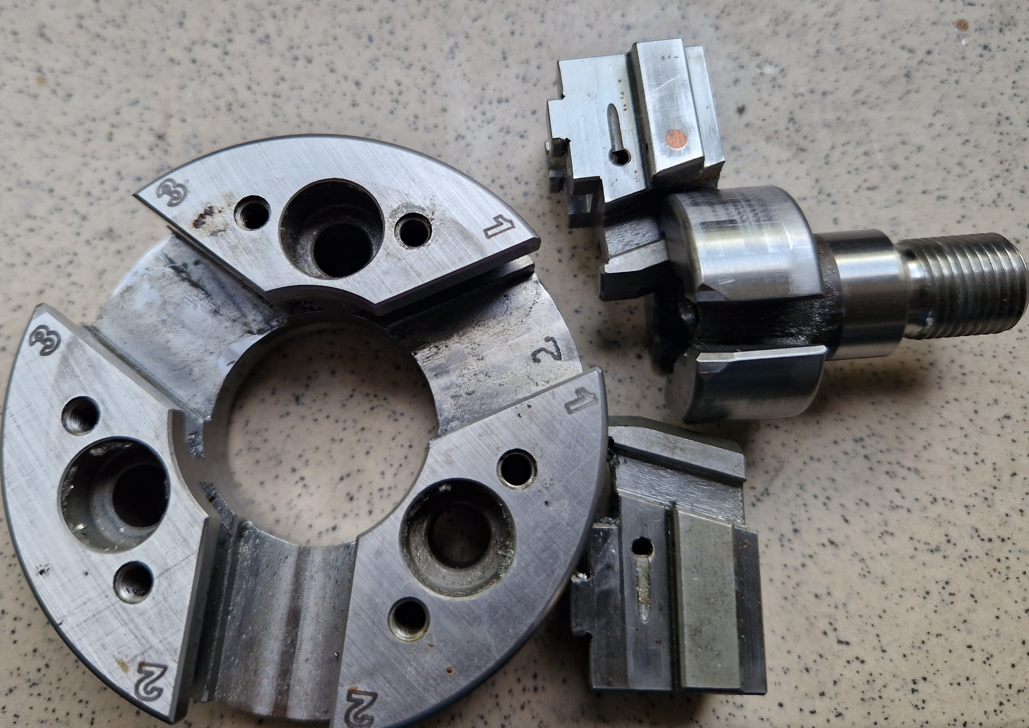Asi začnu funkcí toho pneumatického / hydraulického sklíčidla. Nakonec by se za něj dalo "tahat" i vačkovým mechanismem na kleštiny. Na obrázku je sklíčidlo Rohm 85 - tedy velikost co by "pasovala" i na MNku. Vlevo je to vlastní tělo. Vpravo jsou vidět vnitřnosti. Kulisa se třemi šikmými drážkami. Za tu taháš pomocí toho závitu // M16 //. Sklíčidlo tedy může upínat hřídele i za díru. Krok čelistí je ale malý - cca 2,5 mm. Proto se vyrábějí jednoúčelové čelisti, které se protočí přímo na požadovaný průměr. Sklíčidlo se upíná pomocí těch tří šroubů M8 přímo na přírubu stroje. U MNky bys tedy musel vyvrtat do příruby ty tři závity, nebo si vytočit mezikus.