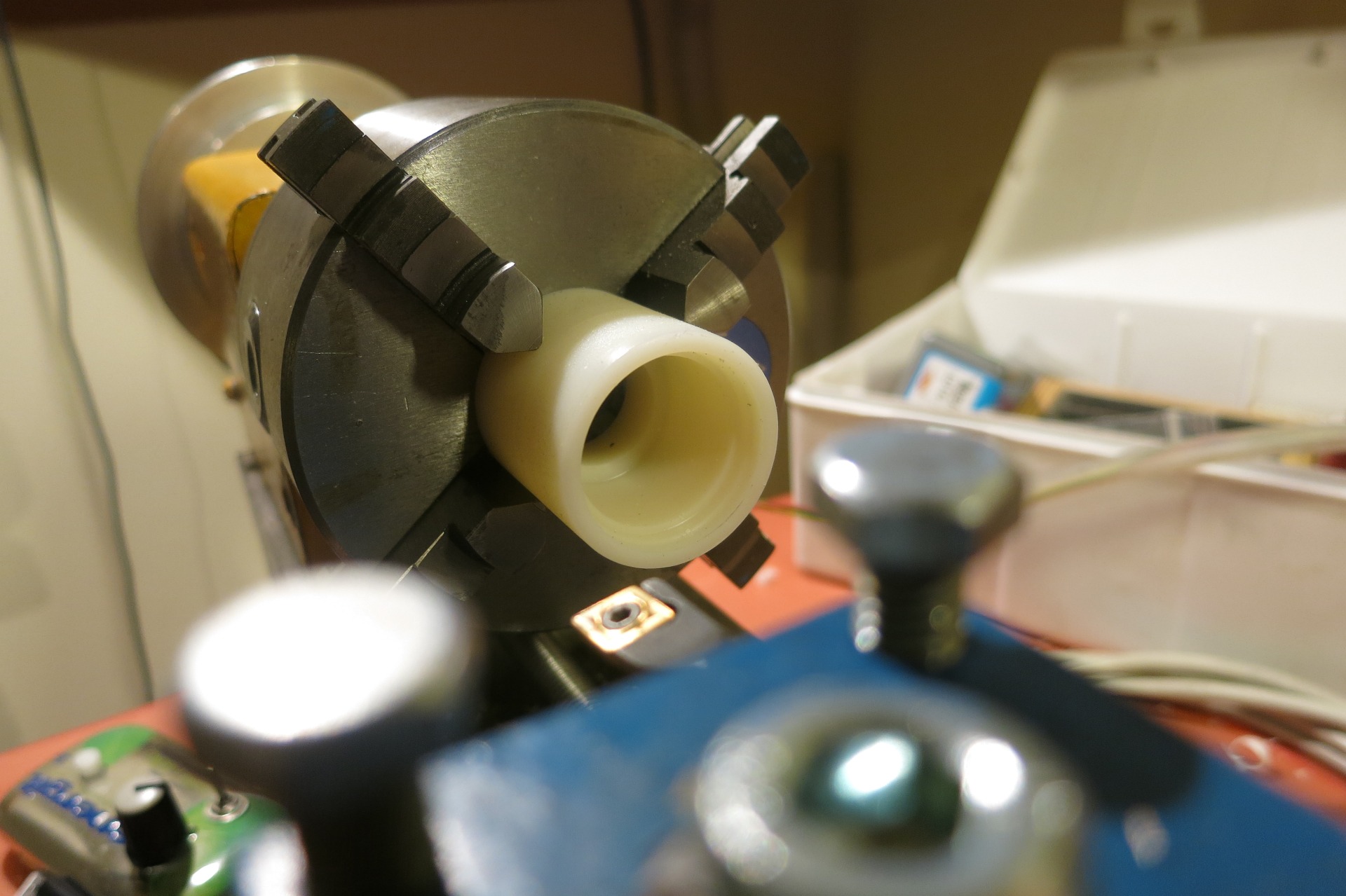 Silonovou maketu budoucí RCK příp. TaperLock redukce na Mazla (vo co go). Ještě zbejvá sjet závit, to už jsem nechal na zítra, musím přet tim Mazla trochu poladit.