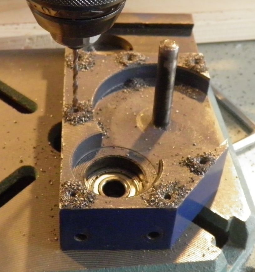 Vyvrtání a zahloubení první z děr - vrták slouží jako zábrana otočení