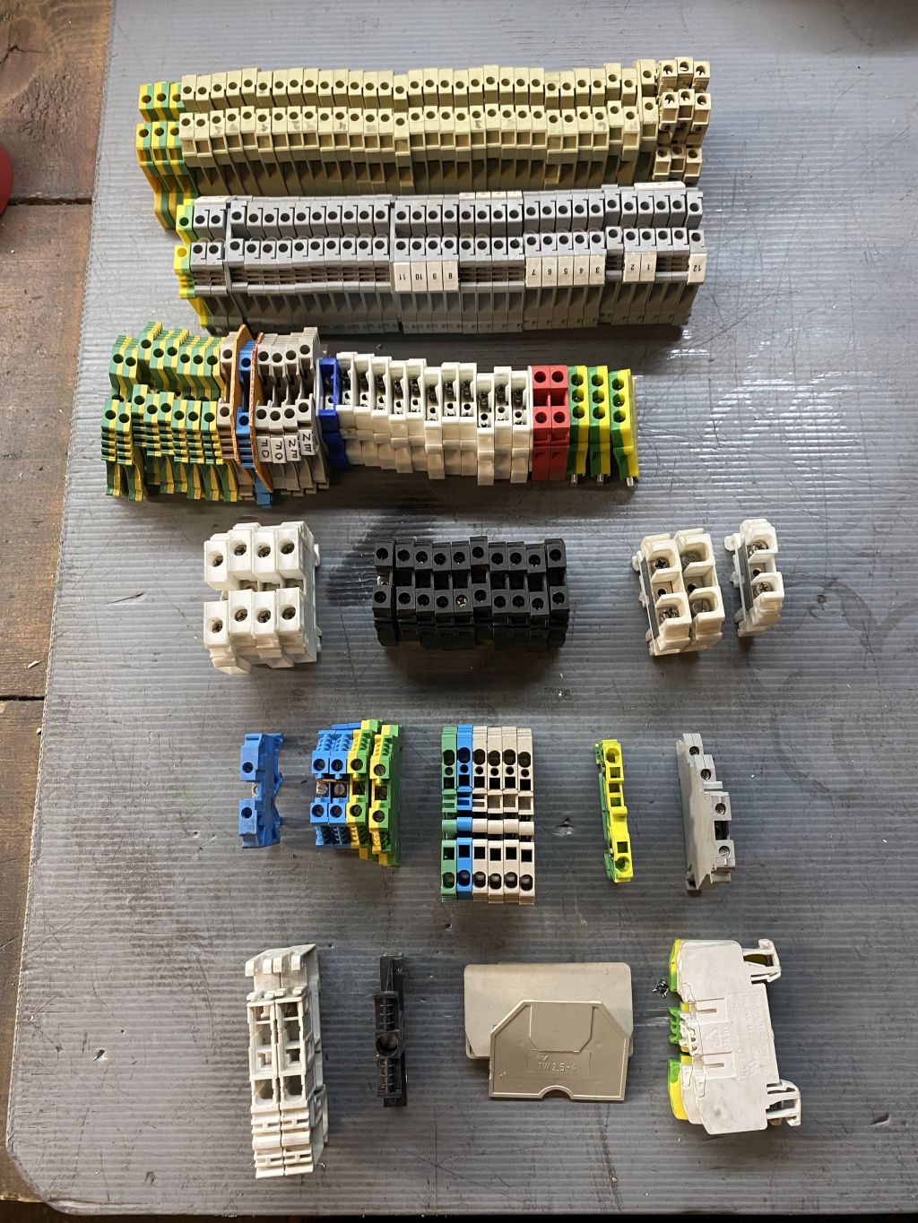 Řadové svorky, na foto není vše, pak jsem ještě něco přihodil Konektory, většina do panelu, stačí jen dokoupit protikusy Kličky na skříně a rozvaděčové zámky s půlměsícem Samolepky které nesmí chybět na žádném bastl stroji v dílně
