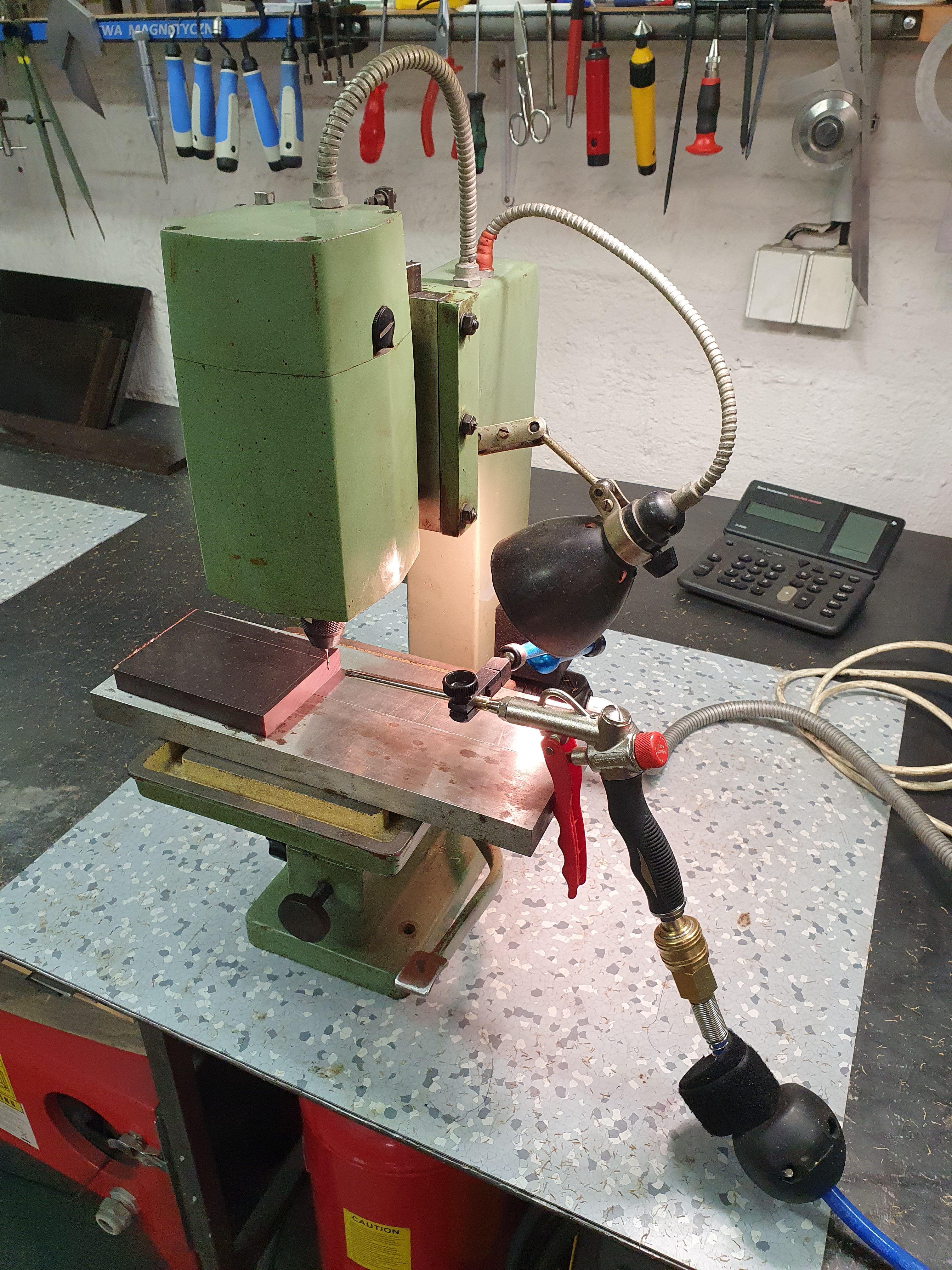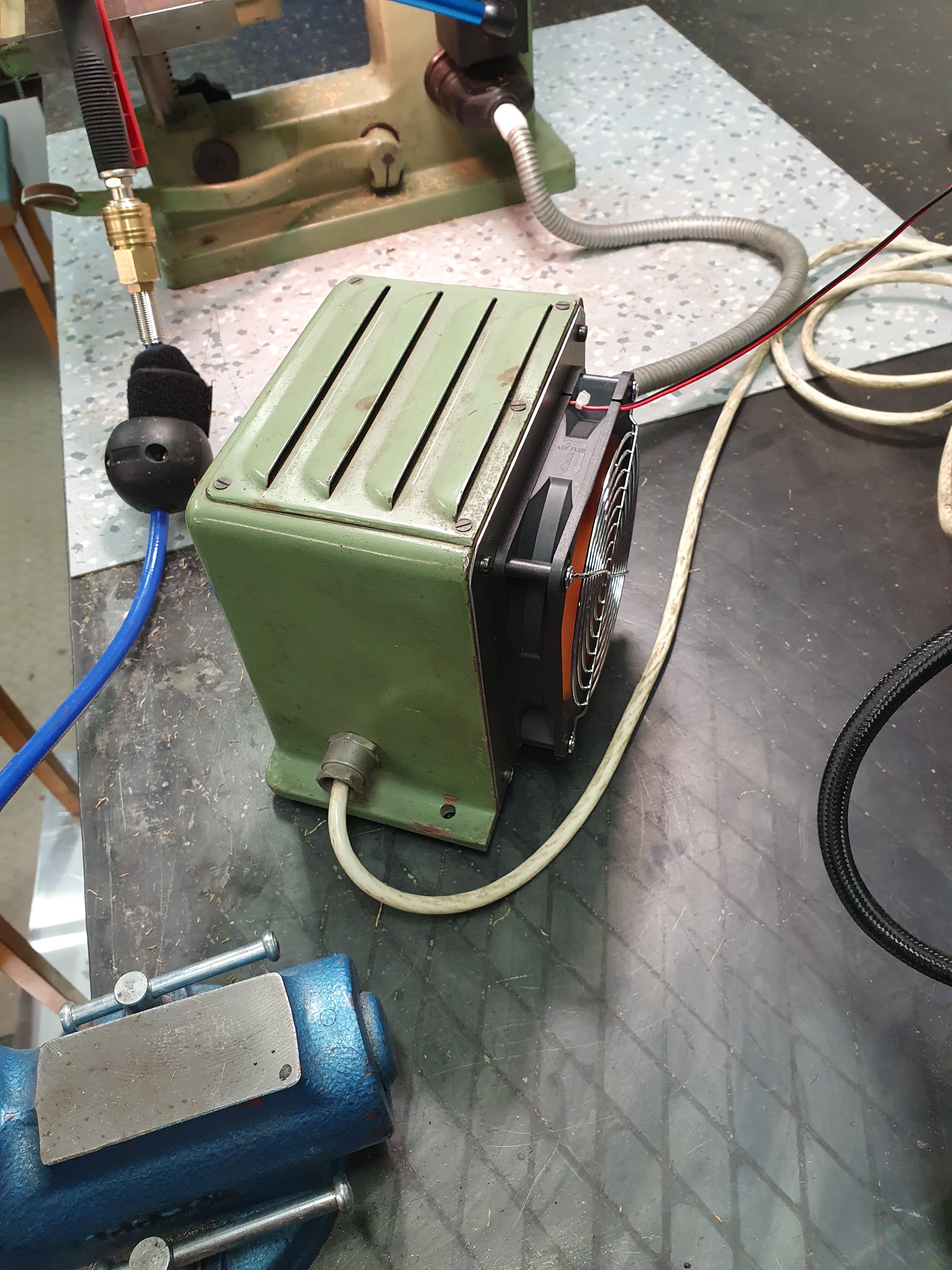 Takže chodí fakt nádherně, jen jsem musel dodělat chlazení reostatu, zatím provizorně na adaptér do zásuvky, hřeje to fakt fest. Ofuk vrtáku a špon z kompresoru nutný, časem zplodím něco trvalého, vrtám pertinax a kartit a vrtáky pálí celkem dost.