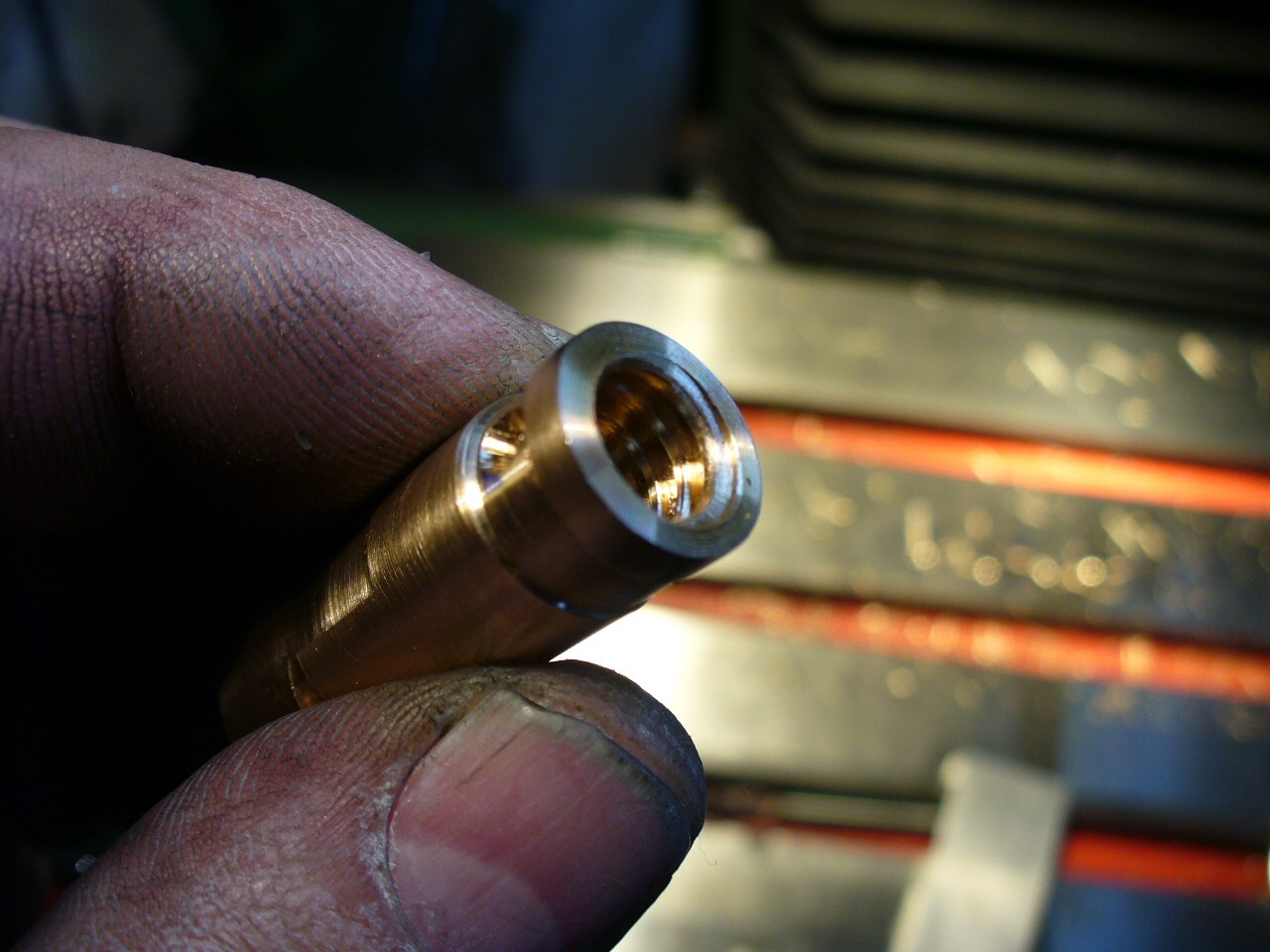 Soustružení nové bronzové matice pro příčný posuv na Schaublina 102, závit je Tr 9x2 v délce 40mm !! :wink: Původně jsem chtěl koupit od číňana závitník a dodělat nový šroub, ale ten origo nebyl vůbec špatný, tak jsem ho jen v jednom kraji zreguloval a vyrobil si svou, oproti originální neštelovací, vysloveně pitomě aretované matici novou se "stavitelnou" vůlí, obětoval jsem 8mm příčného posuvu, šlo by to ještě celé zapustit, ale u tohoto typu je to úplně jedno :) .