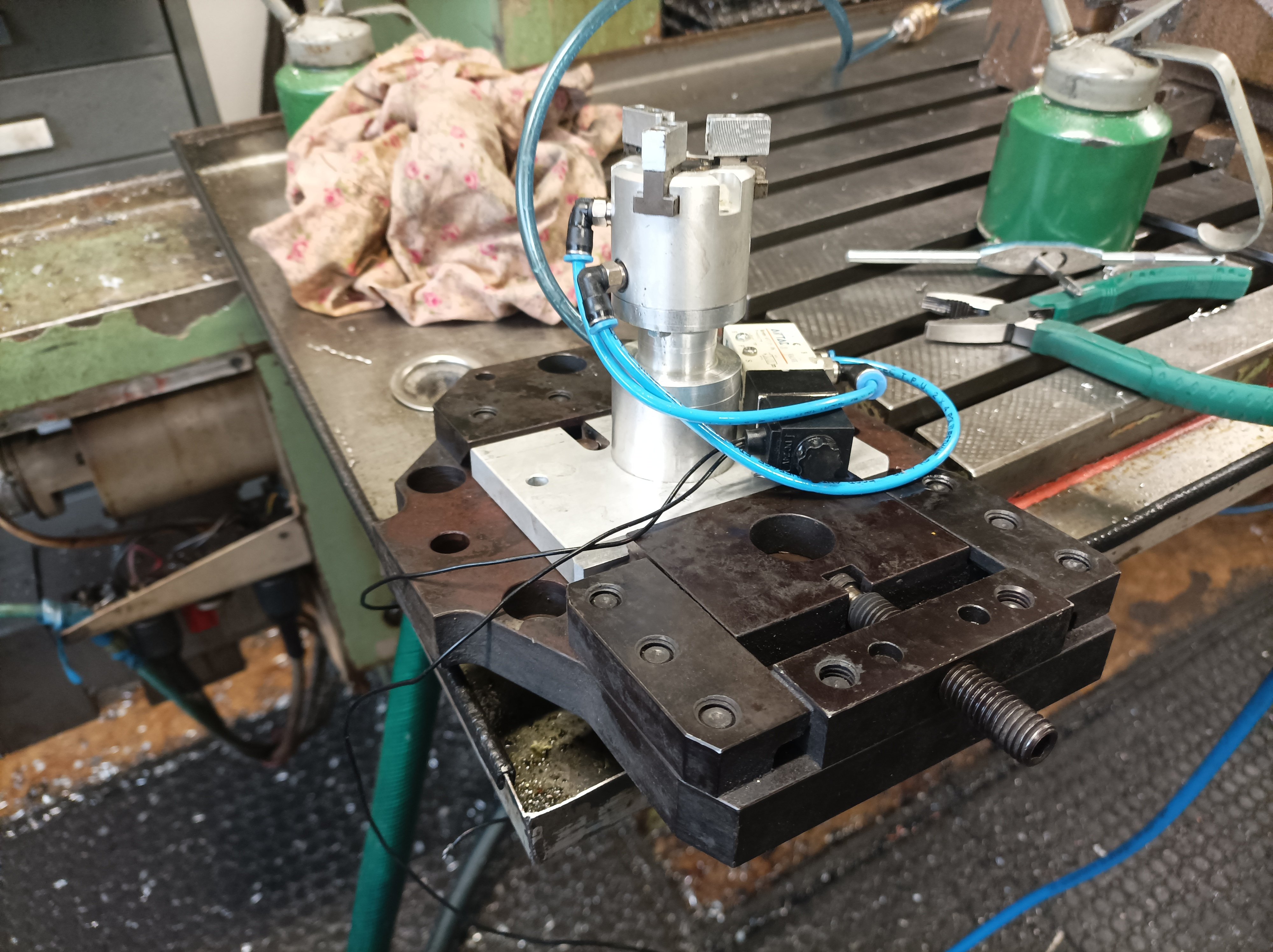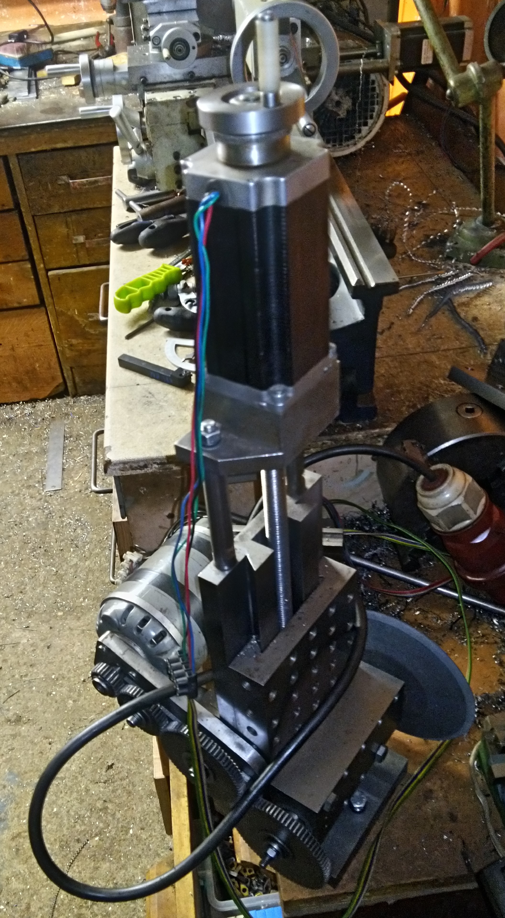Bohužel mám po ruce jen mobil takže to foto není dokonalé. Ten přípravek mám určený primárně pro frézování, mám tam Mk1 kužel a upínač er11. Stavěl jsem si ho jak jsem ještě neměl frézku ale v poslední době s ním více brousím než frézuju protože na frézování už mám tužší mašinku :) . co je to za kotouč netuším, ležel v šuplíku a bez označení :D ale vydrží cca 3 ty závity s stoupáním 1.5mm a pak orovnávám. už jsem takto nabrousil asi 10 závitů. Nejde mi ani tak o tvarovou přesnost ale o geometrickou přesnost, po kalení se ta hřídelka dost prohne takže ji musím přebrousit aby běžely průměry s závitem, jeden závit na té hřídelce stahuje ložiska (ten není na fotkách vidět) a na druhém závitu je matice která drží kleštinu.