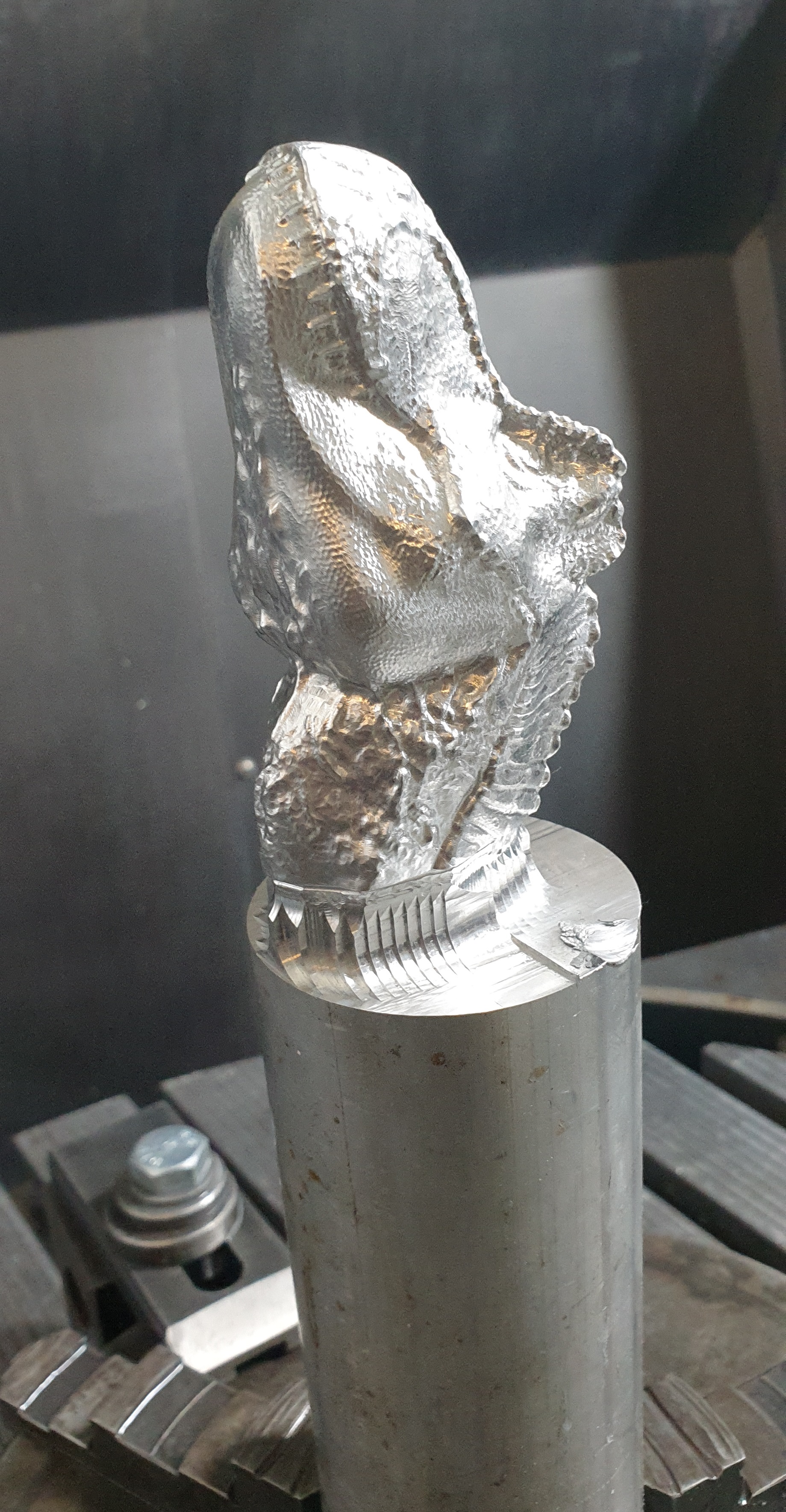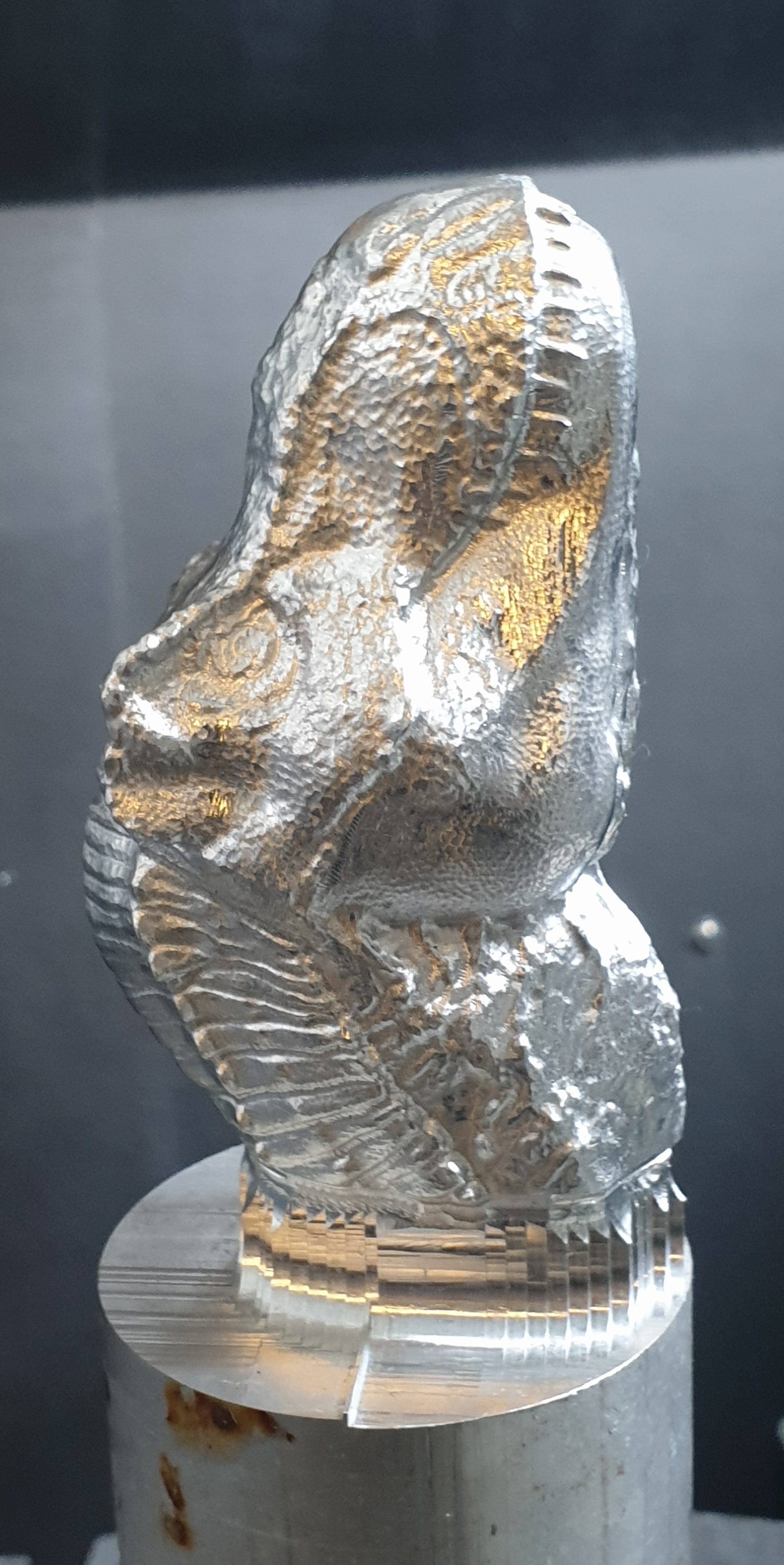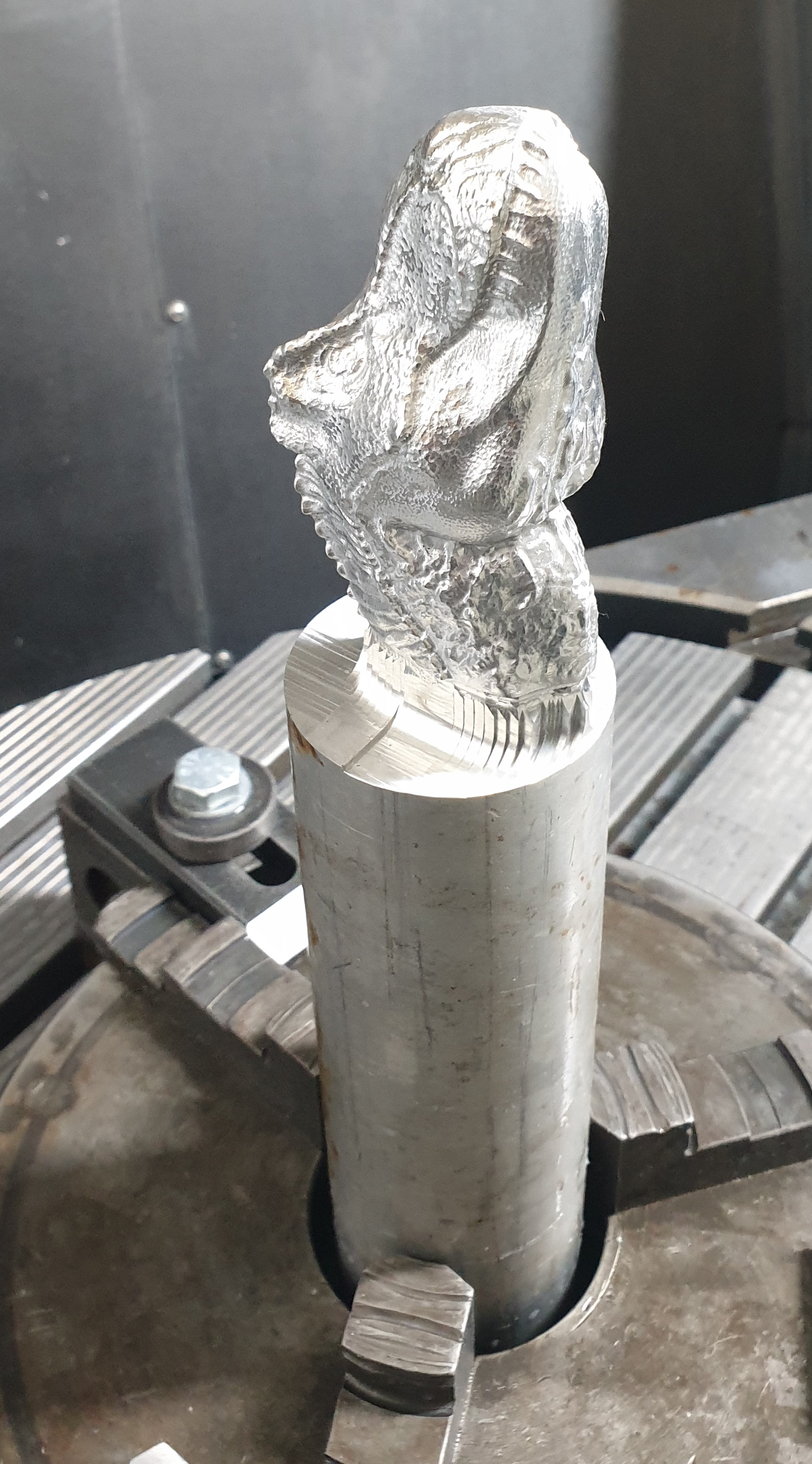 Dnes testovanie nového 5-osého mlynčeka na kávu. Mal som chvíľu čas (klamem, nemal - ale vždy môžem ubrať zo spánku) a testoval som schopnosti stroja (DMU 75 monoblock). Chcel som prevetrať aj Fusion 360, čo dokáže s postprocessorom pre heidenhain. Z internetu free 3D model hlavy T-Rexa (ako mesh súbor), programovanie 2 hodiny, vrátane ošetrenia kolízie (čo dosť zamrzí, lebo Fusion o kolízii vie hneď po vygenerovaní dráhy, ale štandardne upozorňuje až pri simulácií frézovania), program bežal +- 4 hodiny. Reálne by ten čas bol o hodne lepší, ale nástroje čo boli po ruke a zo šuflíka, primárne na oceľ, nepustili. Finálna fréza bola 2mm rádiusová s krokom 0,19mm. Materiál AW 5083, 60 mm priemer gulatiny.