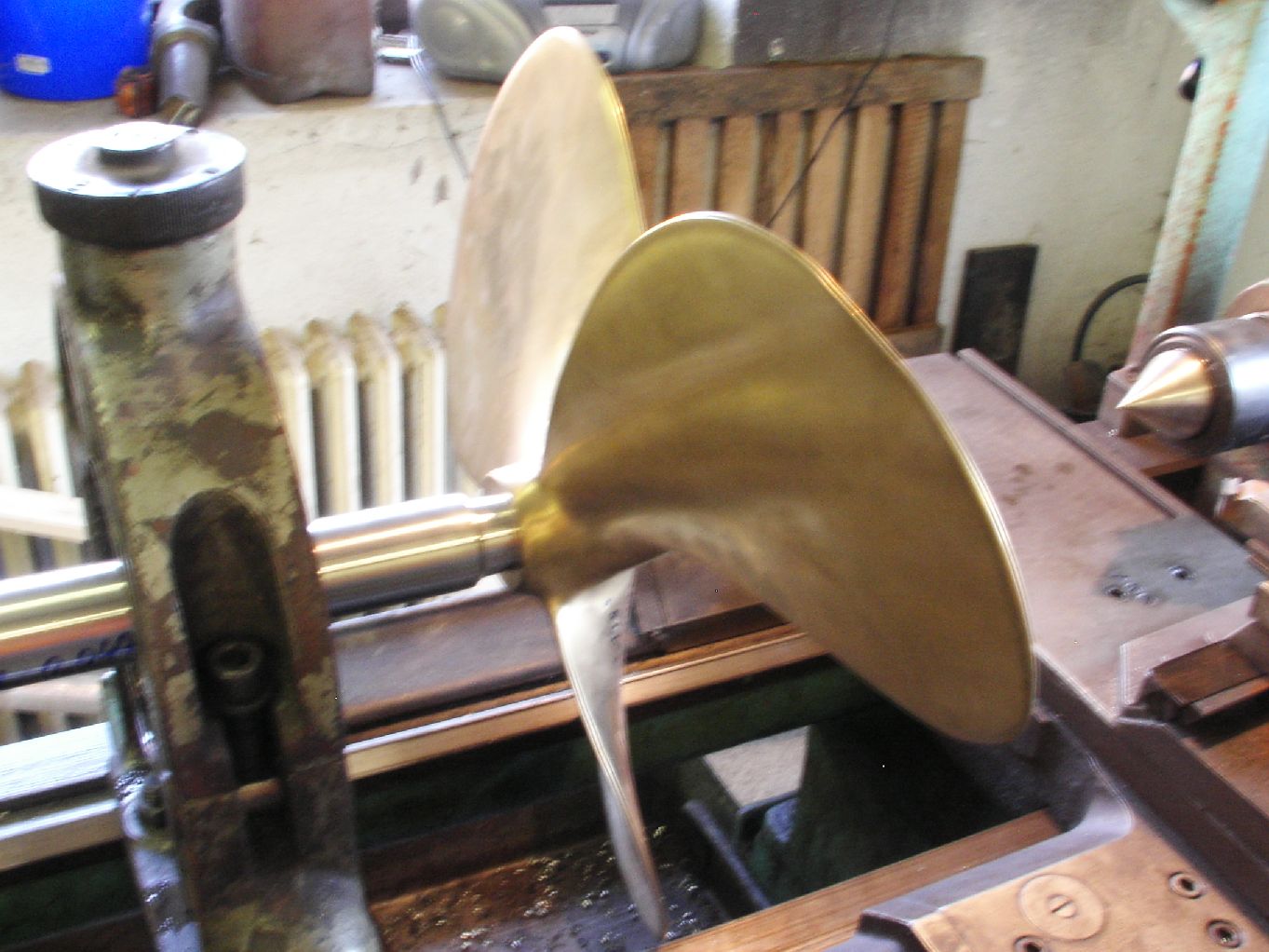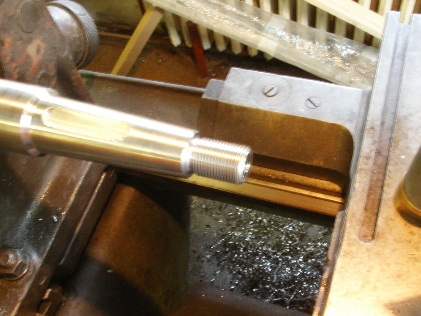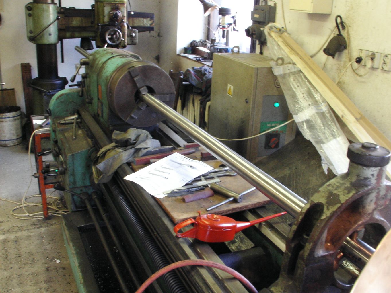 4 metry dlouhá nerezová lodní hřídel průměr 50mm, u které se upravoval kuželový konec pro jiný typ lodního šroubu (nějaký inteligent objednal špatnou hřídel).