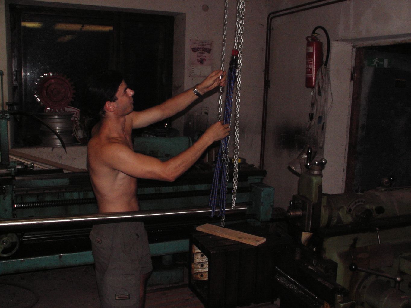 Za pozornost stojí zejména speciální "balancér" ze dvou gumicuků (oba jsou čtyřmo) a kladkostroje pro vyrovnání posuvu v ose Z při frézování drážky.