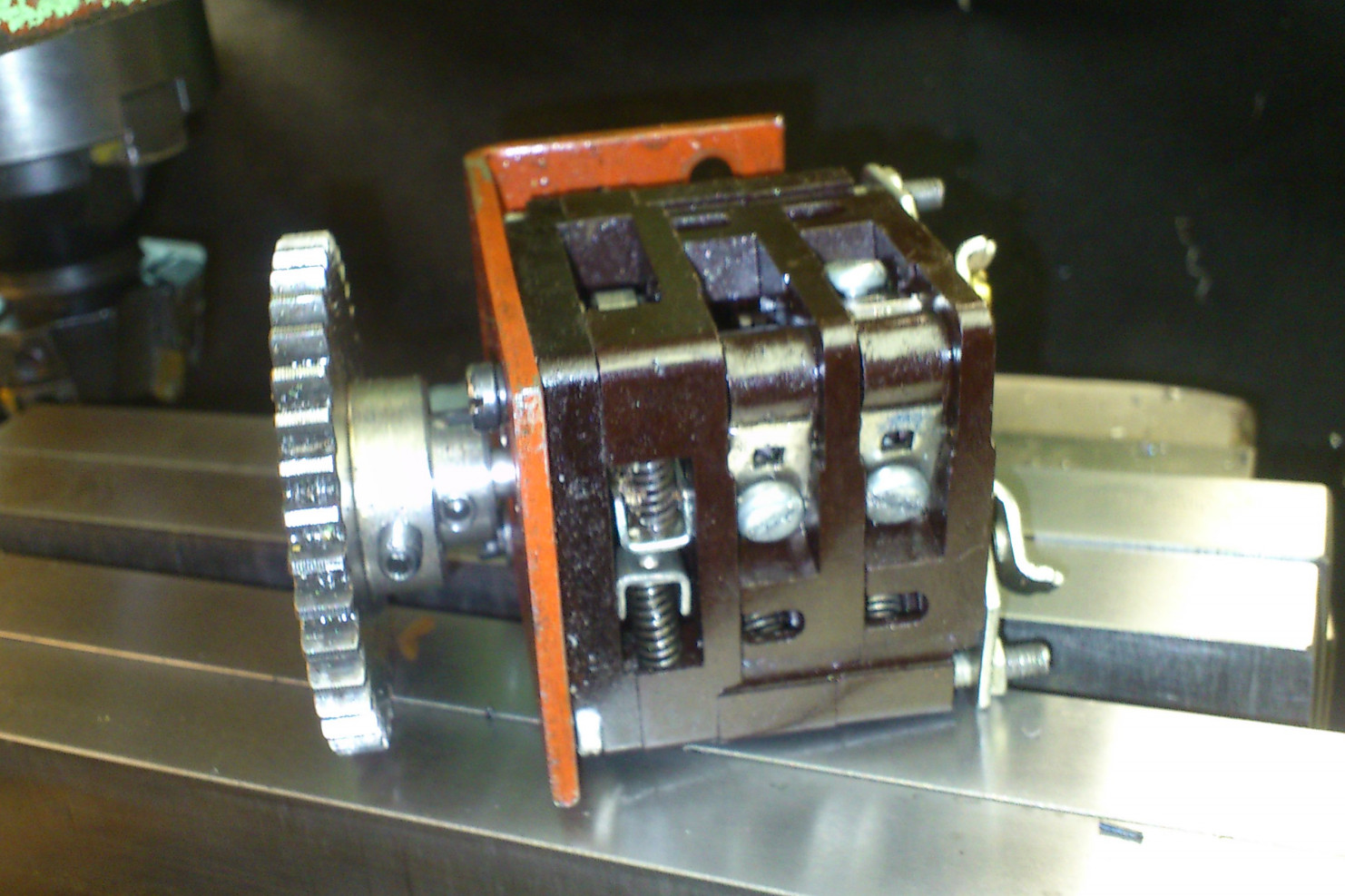 Ozubený ocelový hřeben pro Meoptu do nějakého přístroje, náhrada za původní plastový. Nástroj pro hřeben v modulu 0,7 jsem si vybrousil z hrubozubého pilového kotouče