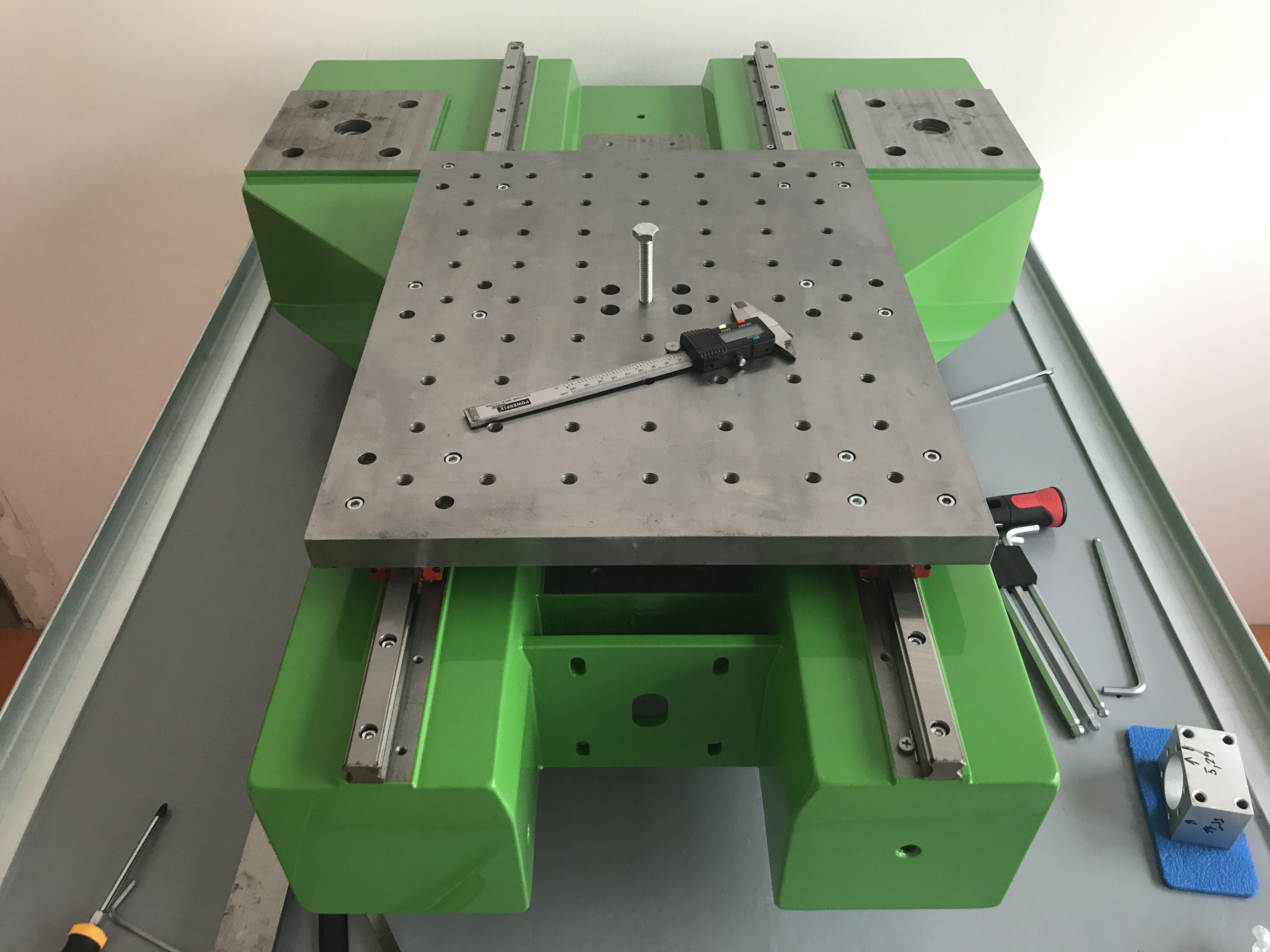 6...u rámu zdá se že jsou plochy frézované na tři průchody nástrojem menšího průměru zkoušel jste rovinnost za pomoci pojezdu osy Z stojánku a uchylkoměru??Připadne mi že základna je hodně tuhá a měla by být samonosná,když dáte na kolejnici jeden vozík na něj stojánek s úchylkoměrem který opřete o vršek kolejnice cca 20cm od vozíku a jezdíte s tím sem a tam mění se nějak odchylka když rám přizvednete třeba uprostřed ??