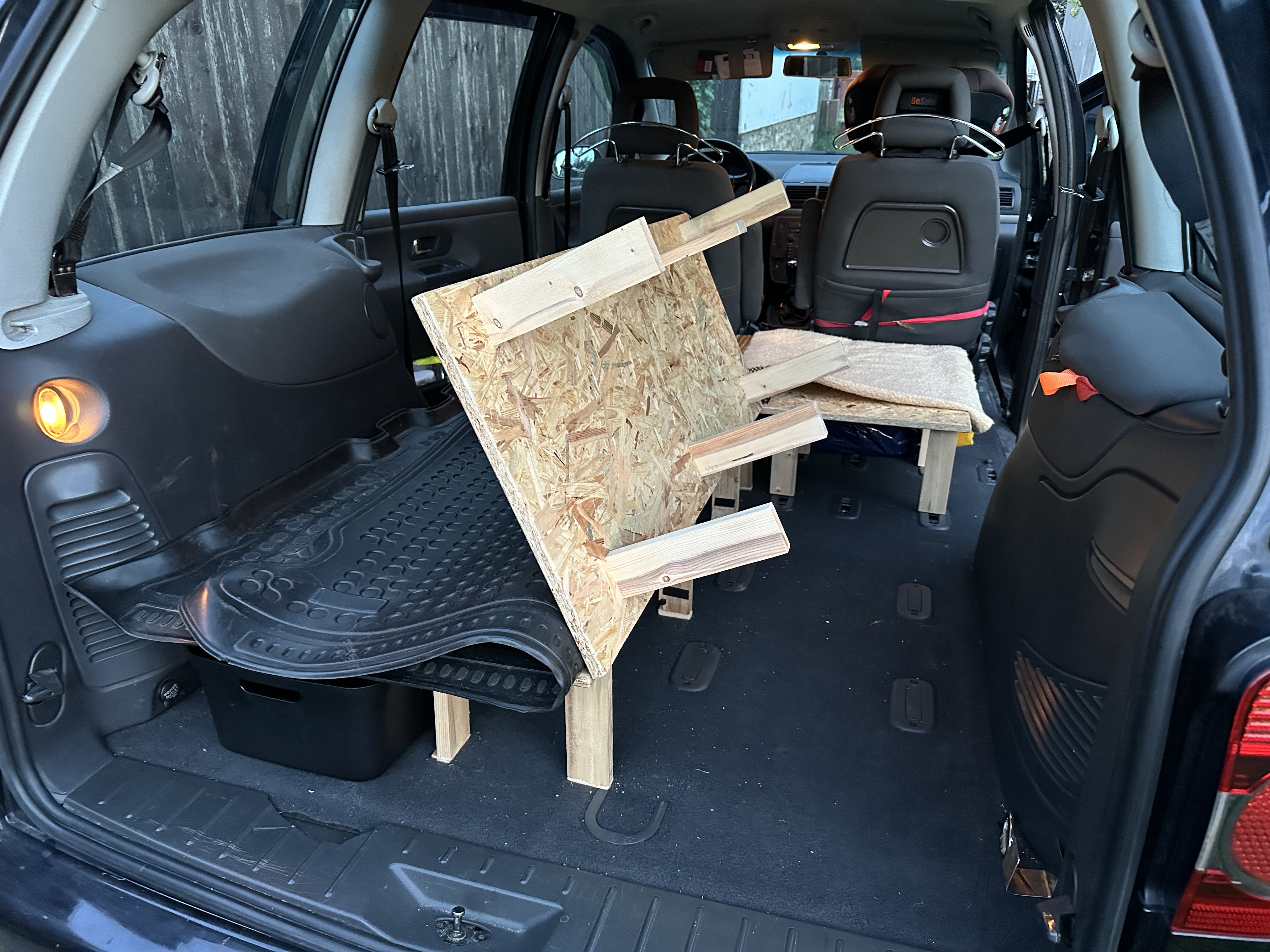Jednoduchá “vestavba” do sharana na vylety a prespavanie v aute. Material osb 18mm, drevo, zadný suplík vysuv 700mm a bocny 500. Je to urobene ako jednospanie s rozšírením na dvojspanie. Matrac sa osvedcil z Dekathlonu 120x190x17 , na jednospanie bude 70-ka.
