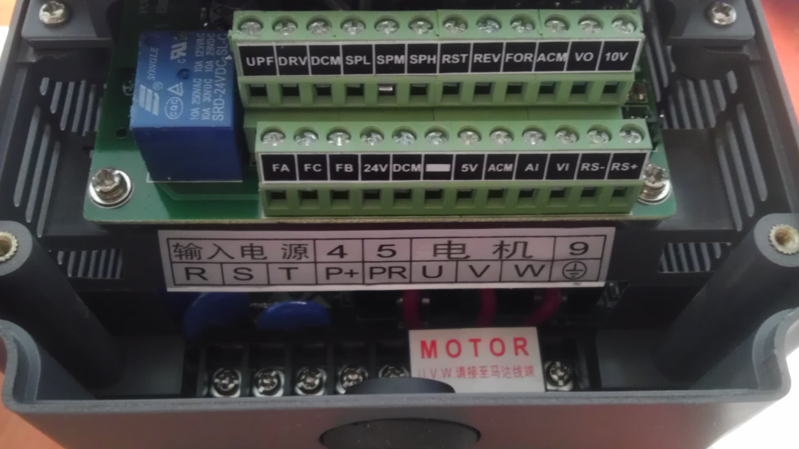 Pracovní vodiče (tedy L-fáze (hnědý) a N-nulák (světle-modrý) pokud to bereš z jednofázové zásuvky) dej libovolně na R, S, T (jedna svorka tedy zustane nezapojená).