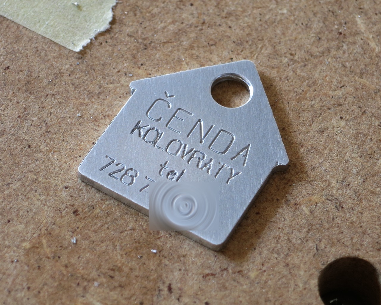 Byl to můj první pokus o gravírování textu do duralu, asi naprosto nevhodným nástrojem (trochu zbroušený zlomený karbidový vrtáček) na gumovém Zázraku™, výsledek tomu všemu odpovídá, řekl bych, ale účel to snad splní :)