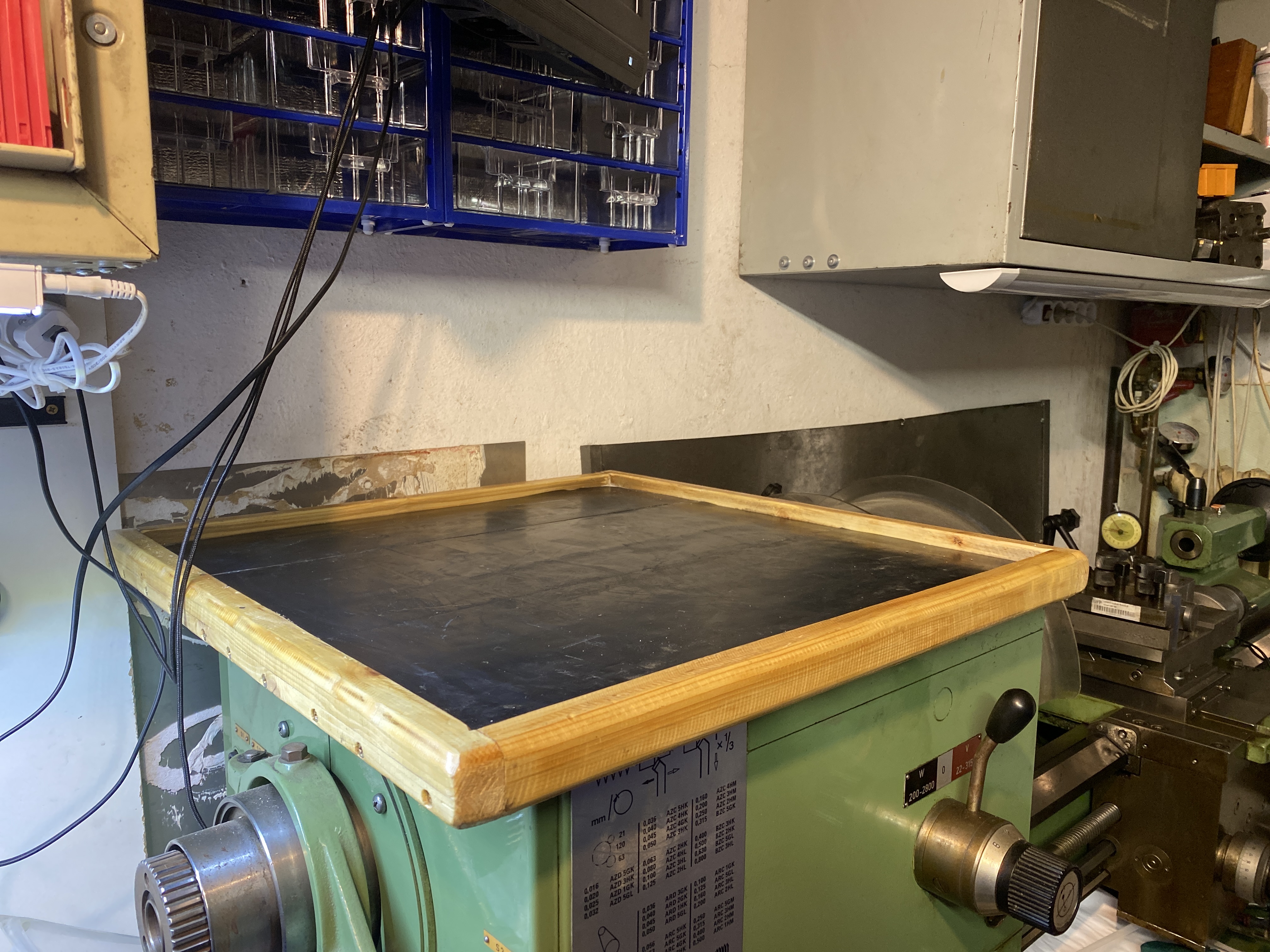 Nahoru na nortonku soustruhu jsem si udělal dřevěnou desku 60x60cm s olemováním - rámečkem z latěk a nahoru nalepil gumu.