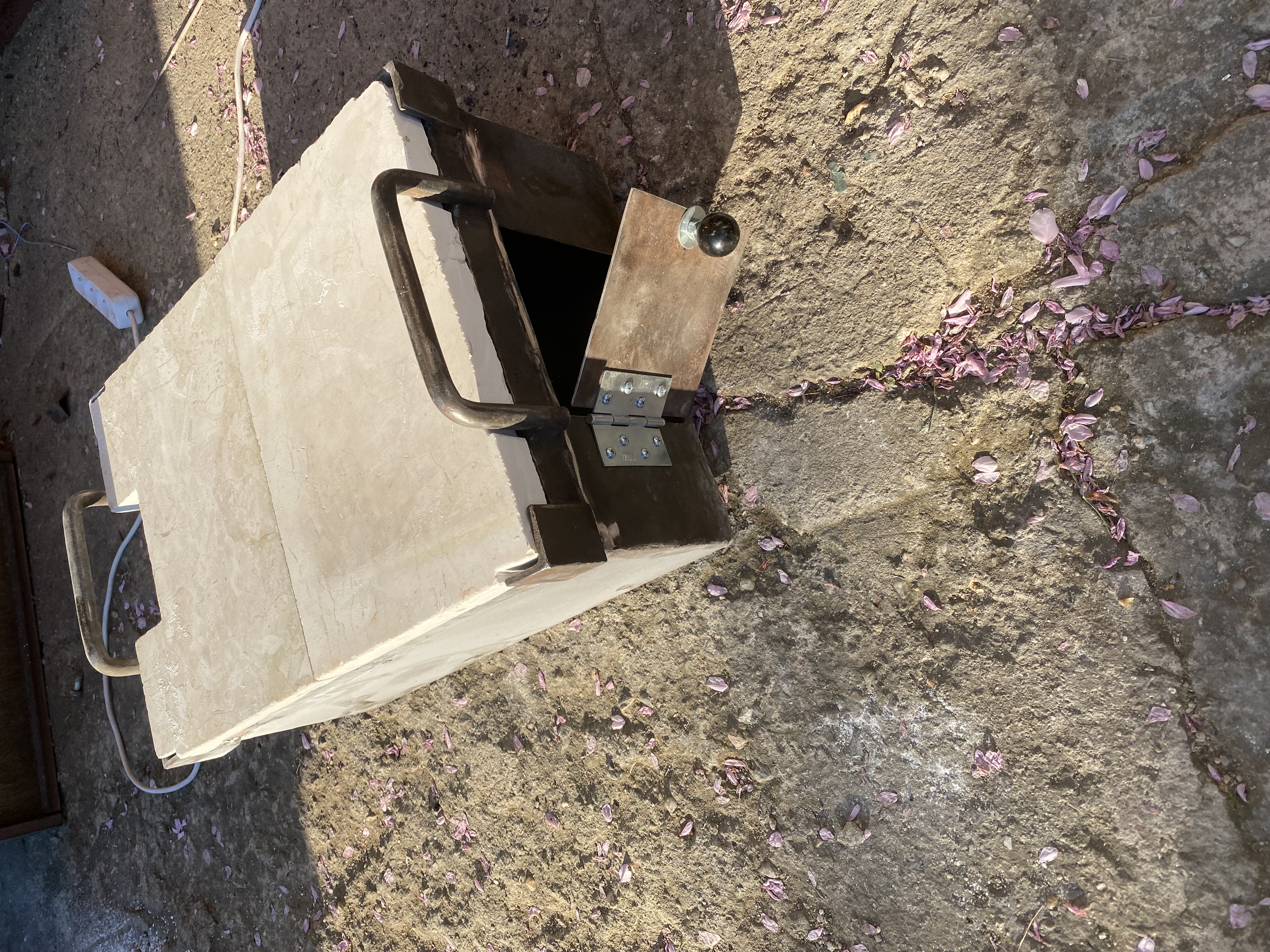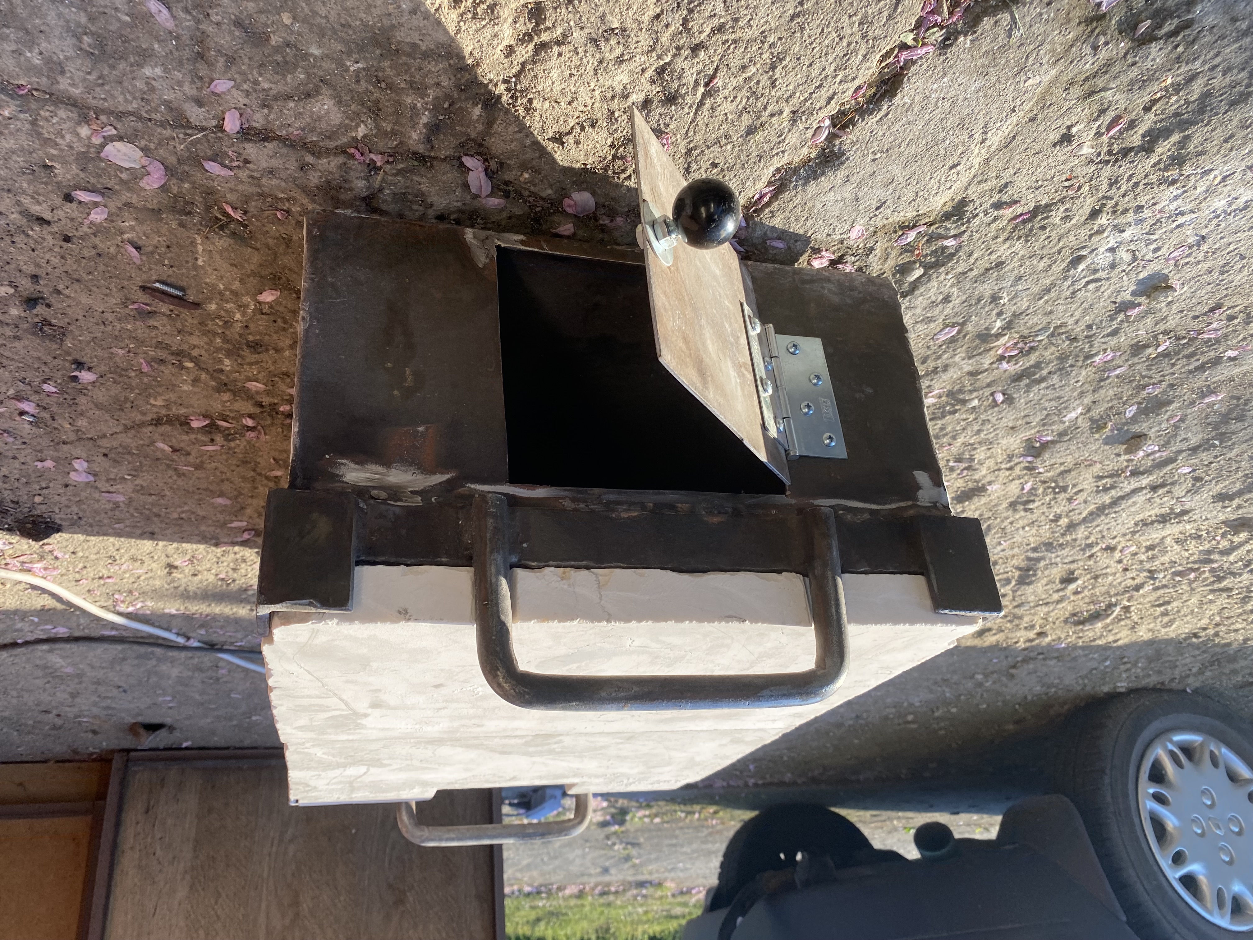 Potom vyřízl otvor pro přikládání a z vyřiznutého plechu udělal dvířka .