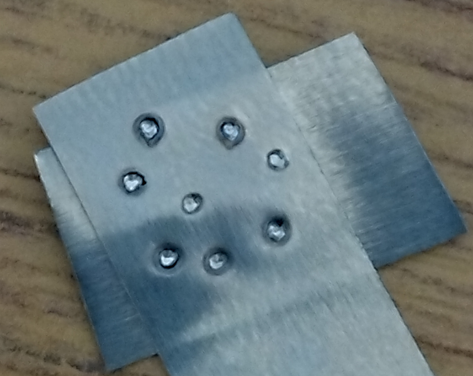 fotky svařených dvou pásků tl. 0,1mm jedna fotka předek druhá zadek svařovaný na skleněné podložce.