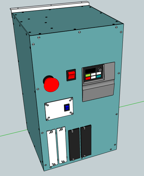 Kupředu levá, kupředu levá, zpátky ni krok.... O co by byl život jednodušší, kdyby rozměry "elektrosoučástek" uvedené v datasheetu odpovídaly skutečnosti. Nedovedu si představit, že by třeba držák motoru měl chybně uvedenou rozteč otvorů. Ale v elektronice, koukám, žádný problém. Takže to jsou spíš "datashity". Až na základě rozměrů fyzicky změřených, vznikla tahle almara s rozměry 230mm x 250mm x 430mm. Nejspíš bude stopbutton mobilní. Pěkně u stroje a ne pod stolem