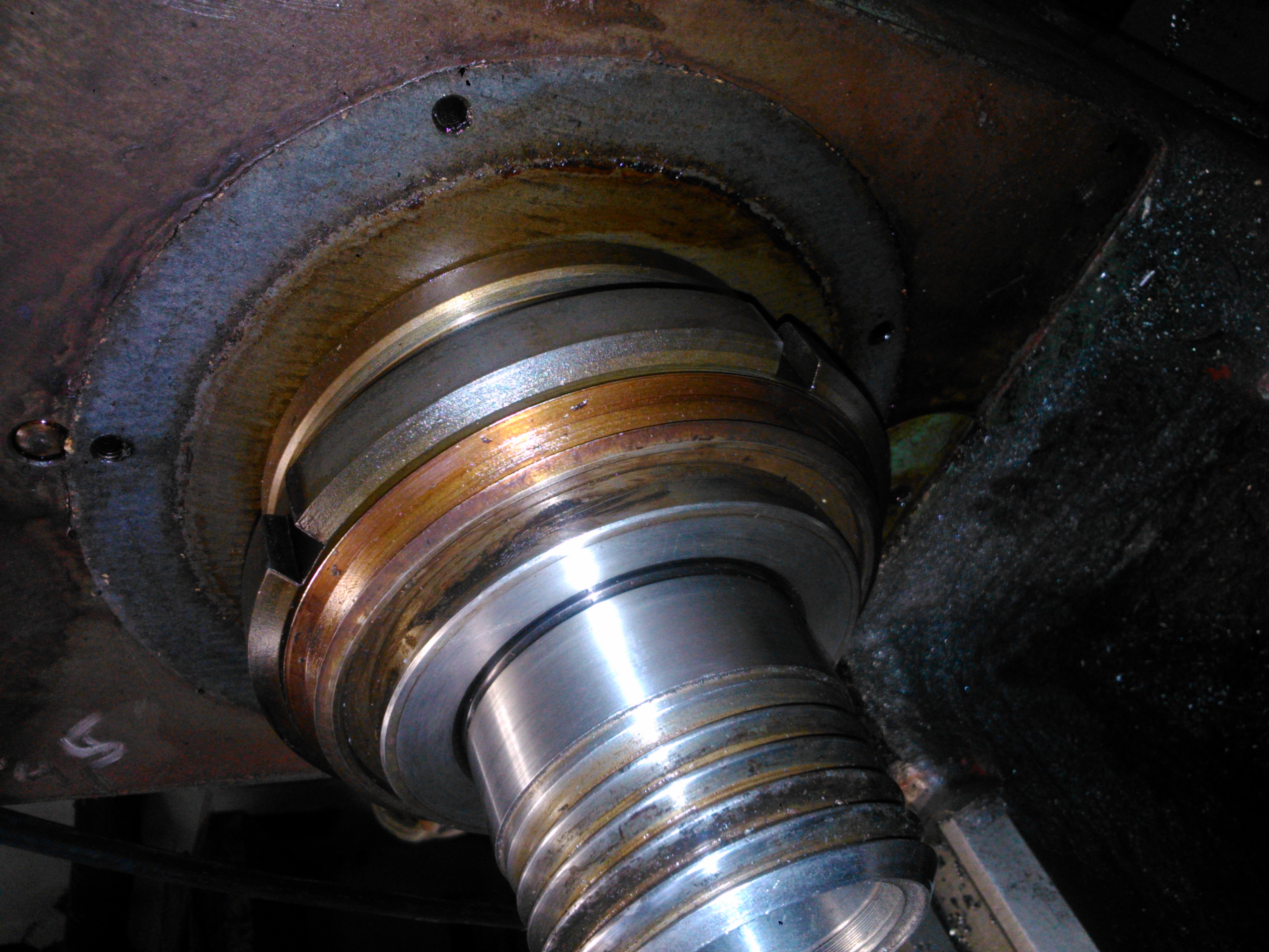 Ložiska jsou podélně rozřízlá a mezi nimi je vložena bronzoplechová distanční vložka, po obvodu je z vnější strany ložisko tuším na třikrát rozžezáno na kuželu a jakoby napruženo dřevěnými špalíky (na obou koncích ložiska vždy v páru), které zároveň slouží jako těsnící prvky radiálního oběhu oleje (typicky pokud ložisko protéká, může to být tím, že tam holt někomu ten špalík vypadl a už ho tam zpátky nedal)