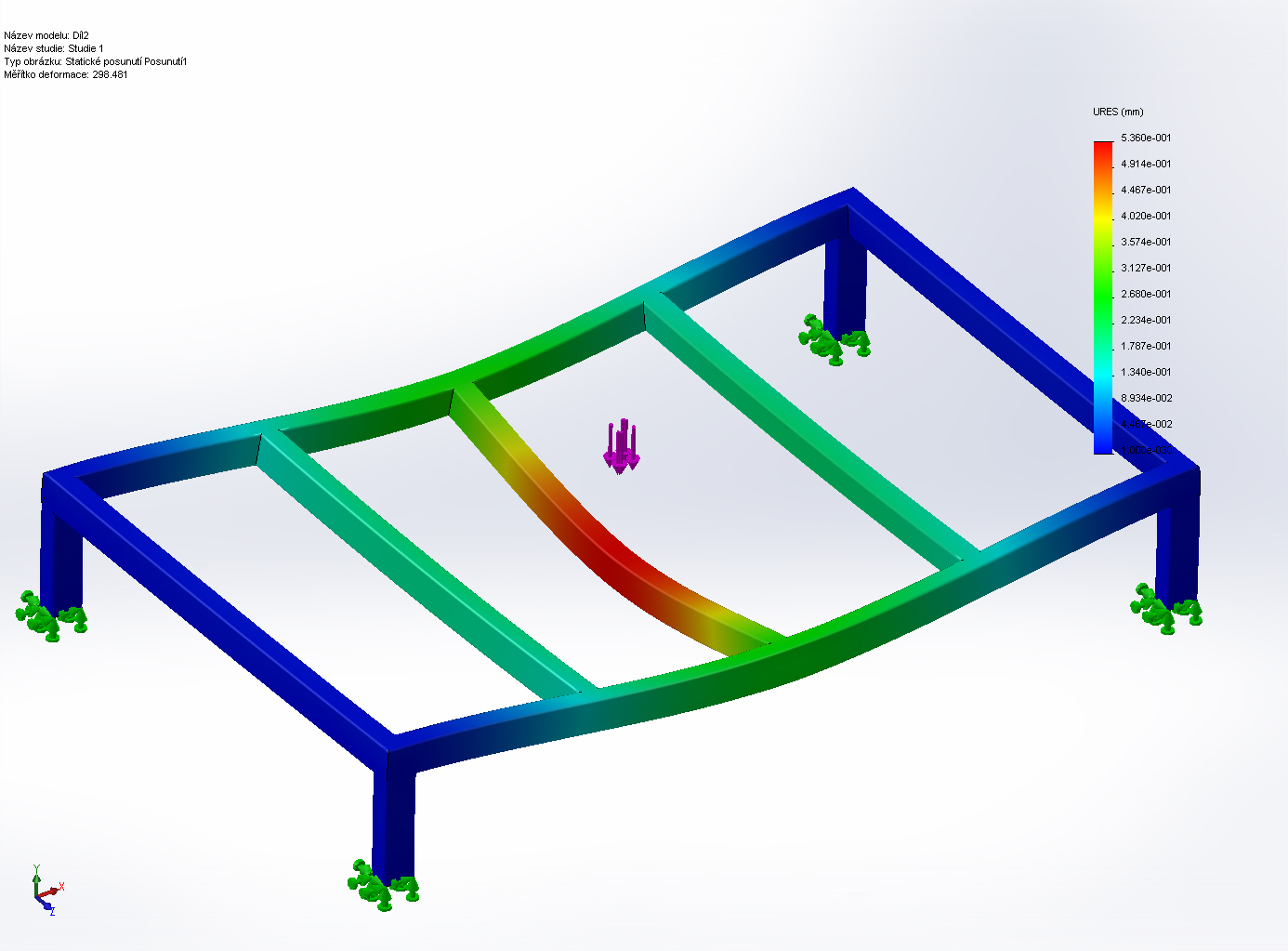 Pokud to počítám správně tak při zatížení v plošce cca 3x3 cm uprostřed stolu těch tvých 120kg udělá průhyb 0,5mm takže jova se docela strefil. nicméně to je varianta když máš ty jekly nastojato. Materiál sem počítal s pevností 360MPa. A musím upozornit že to není ještě úplně správně, v modelu jsou nohy fixně ukotvené jako vetknuté nosníky do podlahy. Ale myslím že tady ani tak nejde o to kolik to unese zatížení. ale o tuhost a náchylnost k vibracím. ono je otázkou a to je teď čistě moje spekulace. jestli při určitých řezných podmínkách se takovýto stůl nemůže chovat jako ozvučnice na kytaře, prostě se rozvibruje