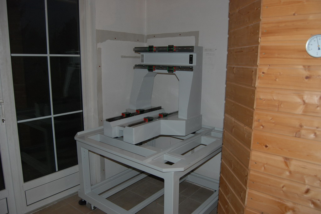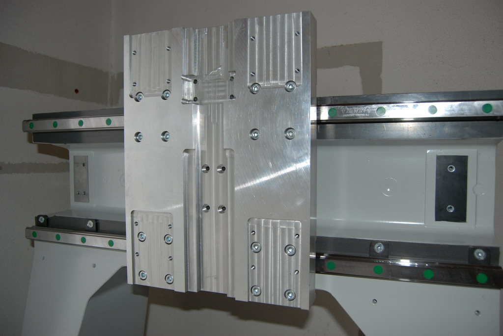 Měl jsem možnost všechny desky (XZ,Z a stůl) koupit přímo u Mullera. Ale znamenalo by to další náklady 50 tis. Takže jsem to nakonec udělal z litých bloků od Alcomu - vše tloušťka 40mm. V okolí mi to nikdo nechtěl obrobit - tak jsem si to obrobil sám. Trvalo to sice dýl, ale dal jsem tomu všechno co jsem uměl. Stůl je taky z 40mm silné desky a na ní je přišroubován T-stůl 20mm - v případě opotřebení/zničení lze vyměnit. Při montáži jsem kontroloval hodinkama jestli se po dotažení šroubů vozíků nemění poloha desky. To se samozřejmě dělo - takže vždycky vyndat/upravit/vrátit. Příjemný bylo zjištění že odchylka kolmosti os X a Y je 0.015/200 mm. Portál se spodkem byl spojen už od výrobce a bál jsem se aby se to při přepravě a manipulaci nějak nehlo. Nakonec to dopadlo dobře.