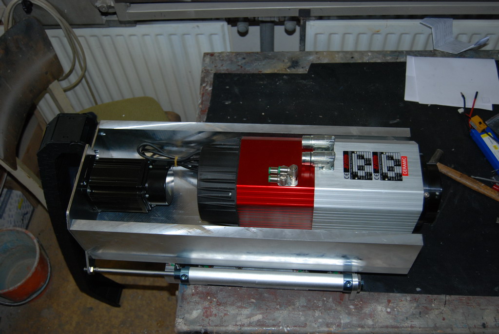 Pár dalších fotek. Dlouho jsem zvažoval jak odlehčit Zko - má cca 80kg. Protizávaží jsem zavrhnul hned - zhoršilo by to hodně dynamiku. Pak jsem uvažoval nad plynovejma vzpěrama, ale ty jsem nakonec taky zavrhnul. Zdálo se mi to takový fórový a nemají lineární průběh síly. Takže nakonec jsem použil dva vzduchové písty FESTO, které jsou napojené na malý vzdušník (starej malej hasičák). Pomocí regulačního ventilu je vzdušník natlakován na potřebný tlak k vyvážení. Po připojení vzduchu ke stroji se automaticky dofukuje na nastavený tlak (pro případ úniků). Funguje to až překvapivě dobře.