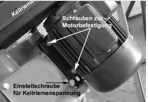Obrázek by mohl být názornější, je z návodu, ale snad bude stačit: Princip zvratné páky - černá šipka ukazuje na šroub s kontramatkou, zašroubovaný ve výstupku "houpačky", přesahujícím kousek za její osu. Přitahováním se šroub opře o podstavu, zvedá "svoji" stranu a tím motor klesá a napíná řemen. (To šedé dole je víko převodovky ke druhé řemenici ...)