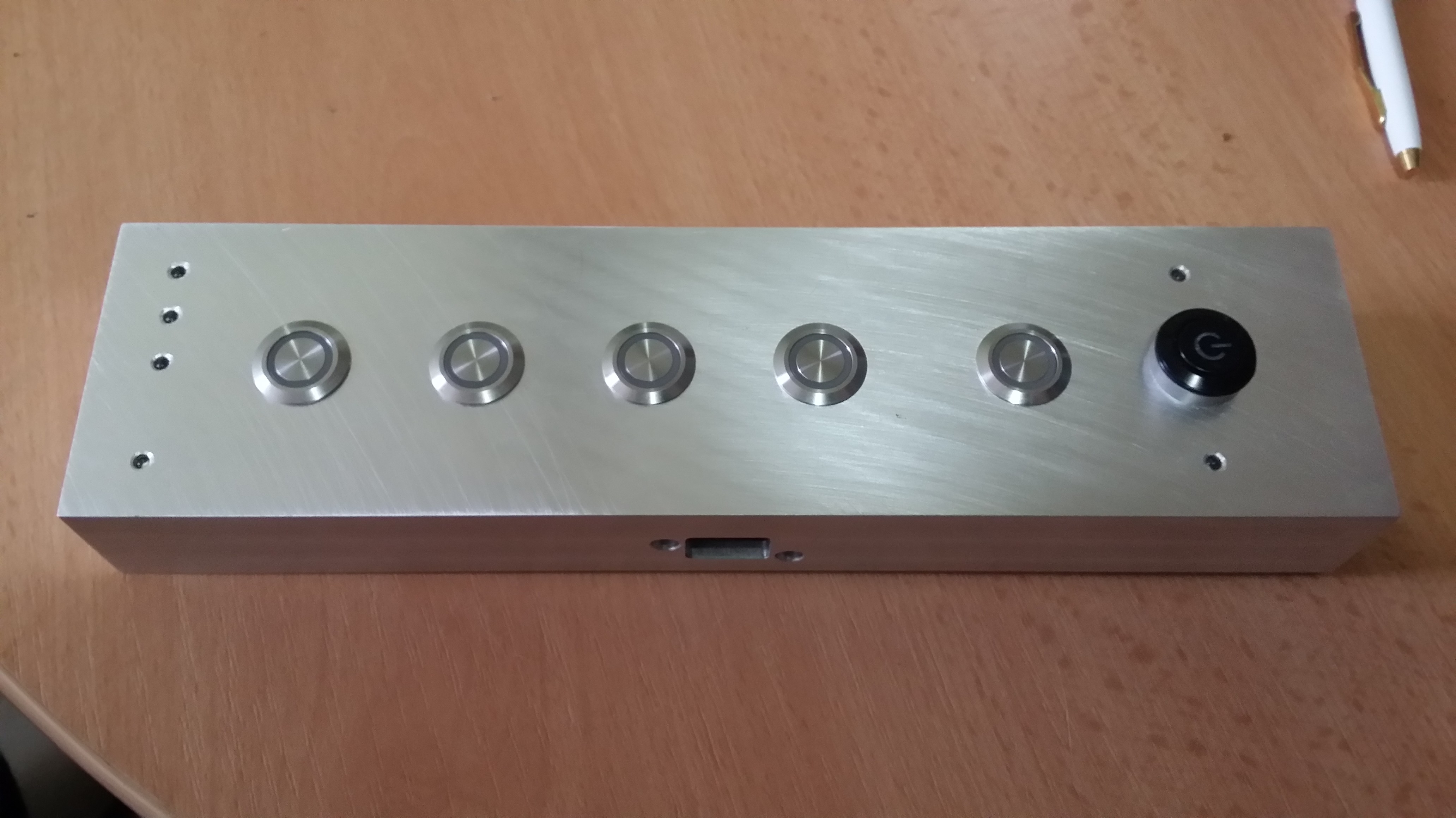 Krabička s vypínači pro ovládáni naší nové CNC frézky. Na boku jsou vidět otvory pro USB.