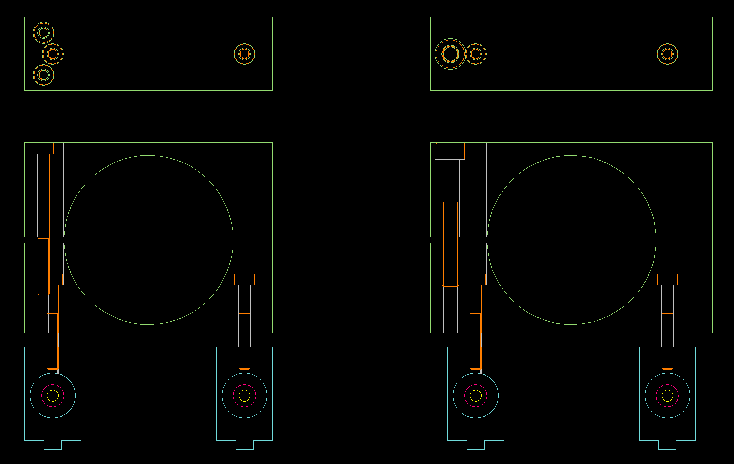 přemýšlím nad zadáním výroby alternativního uchycení, originální držák je moc pěknej, ale dost nekompatibilní se stávajícím Zkem zázraku™, nechci to celý překopávat. Nápad je udělat dva, které se přišroubují krz desku přímo na vozíky Z-ka do M4 otvorů (nejde o lineáry, vypadají takto), díky tomu to nebudu muset nijak modifikovat, jen vyšroubuju stávající šroubky, taky to skoro určitě bude nejtužší možné uchycení. Vozíky (resp. jejich osy) jsou od sebe 68mm, vřeteno má průměr 60mm, takže je to dost těsný, ale něco se vymyslet dalo.