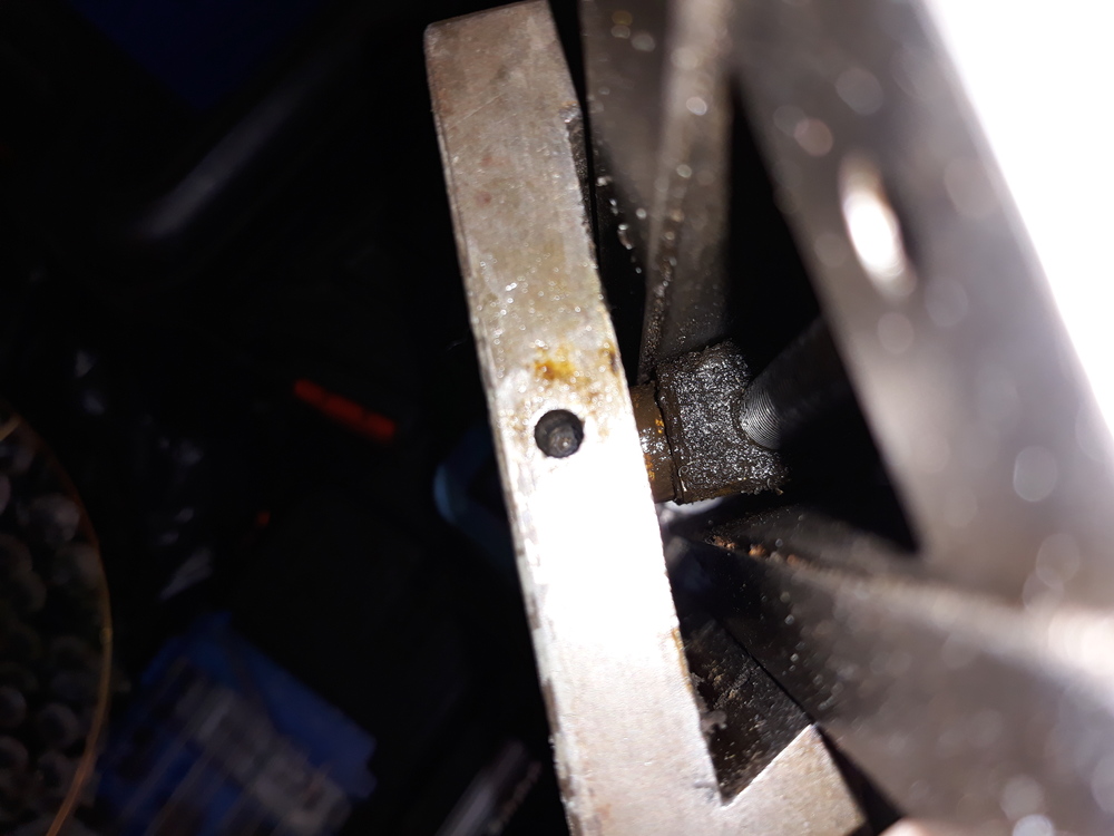 2. Potreboval bych vytahnout paku, ktera zajistuje sevreni matice pro podelny posuv pri rezani zavitu. Evidentne je to zajistene sroubem s ctvercovou hlavou, ktery se nedari povolit. Je muj predpoklad spravny? Po uvolneni bych rad obe casti rad vytahnul a vsechno dukladne procistil od drevenych pilin, ktere jsou zalezle uplne vsude. Premyslim, jestli to nahrat nebo zkusit povolit jinak. Zkousel jsem i klic na srouby nozovky, ten ma bohuzel o 0,5mm mensi rozmer, takze ho tam nedostanu. Nejaky tip na to, jak to povolit?