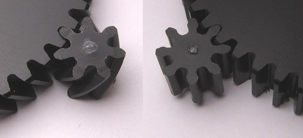 Nechal jsem to běžet hodinu a zdá se že to neztratilo žádný krok, otáčení frézy i ozubeného kola bylo stále synchronní a vytvořené zuby stále stejné. Potud je vše OK.