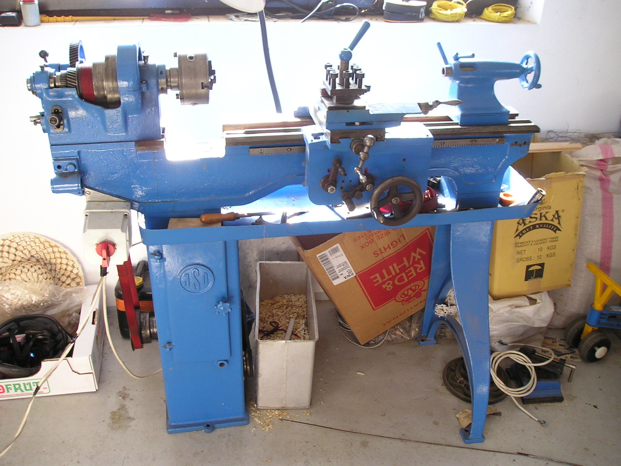 Taky mám podobnej,asi před čtyřmi roky jsem ho koupil od jednoho chlapíka v docela hrozným stavu do sklepa na drobnější práce a na plasty a po roce se dostal k tomu abych ho zprovoznil.Je tam podélný a příčný strojní posuv dvojitý.Na levé straně suportu je páka kterou spínám dělenou matici a používá se výhradně na řezání závitů.No a na čele suportu je přepínací páka LANG nebo PLANE která spíná cca poloviční posuvy které se nahání od ozuběného kola od posuvového šroubu na kterém to kolo pojíždí