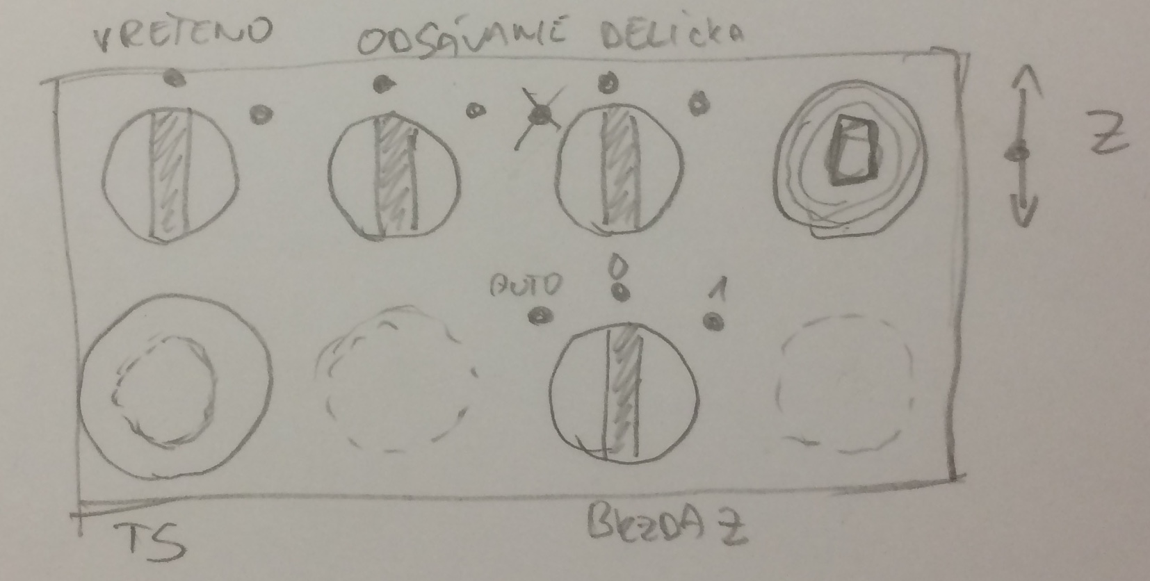 - Zatial sfinalizovany navrh ako to bude na ovladacom paneli, nerad by som daval novu skrinku. Miesto start/stop dam otocne hlavice, nakolko ich mam a zaberu jednu poziciu. Este tam chyba tlacidlo na "nahodenie" po stlaceni total stop, to asi pojde na skrinu rozvadzaca.