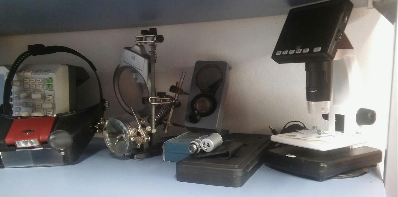 Pokud jde praci s PCB, tak ja se pod mikroskopickou kamerou ani za nic nemuzu kloudne zorientovat. Zkousel jsem to par let a nejde mi to. (Mikroskop je znacka dnt, za cca 10tKc pred 5-6 lety, viz foto moji domaci slepecke policky. Rekl bych ze to bude dost podobne tomu z Banggoodu.) Pod lupou je pro me ta prace prirozenejsi a pohodlnejsi. Nejvic rozhodne pouzivam bryle vlevo. Je to asi vec ergonomie a zalezi na danem cloveku.