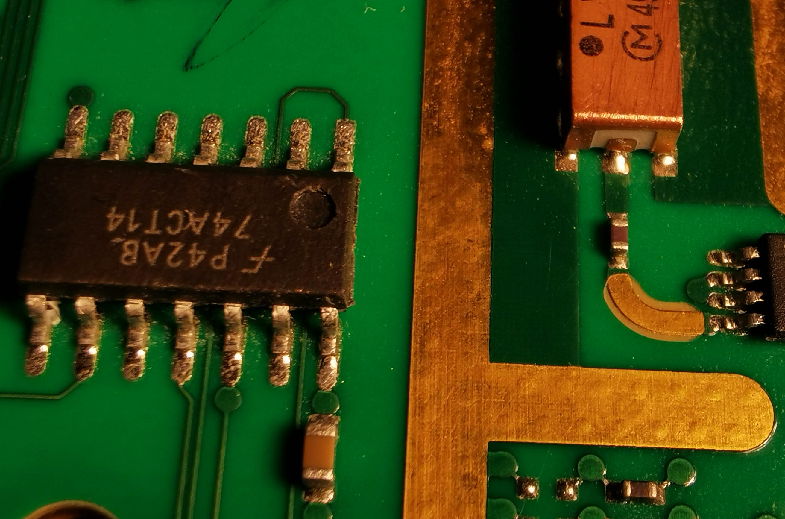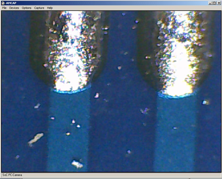 To na obrázku jsou přiletované konce noh procesoru. Rozteč těch noh je 0.5mm, dráhy na tišťáku mají 0.15mm. A to je nejmenší zvětšení, které s tou kamerou udělám.