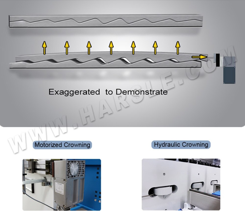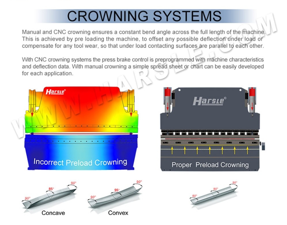 pri ohýbaní dlhých dielov sa materiál neohýba rovnomerne. vplyvom tvárniacich síl sa deformuje celý rám stroja a v strede je plech ohnutý menej ako na krajoch. na kompenzáciu tohoto vymysleli "bombírung". spodný stôl sa vopred zdeformuje (ručne, elektricky, hydraulicky - podľa stroja) tak, aby vytvoril kopec. veľkosť deformácie sa určuje zo sily ohybu. v lepších prípadoch to vypočíta systém, alebo sa ide odhadom na základe skúseností.