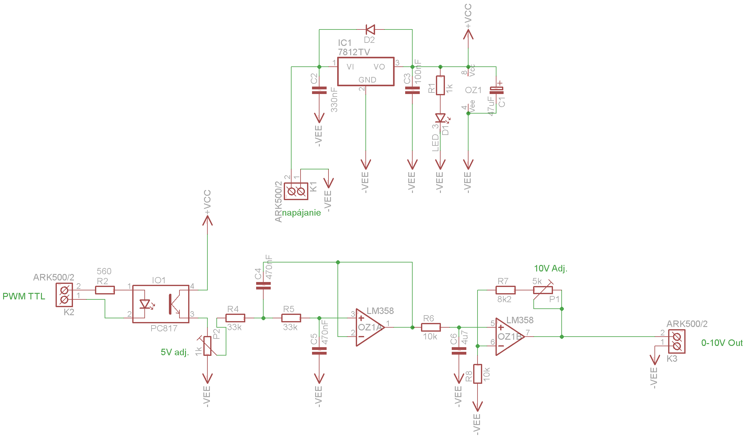 Pridávam niekoľko vlastných postrehov s riadenia motora z Mach-u cez PWM. Nájsť na webe zapojenie na dobre funkčný PWM 0-10V nieje také jednoduché ako som si myslel, navyše som chcel optické oddelenie. Po odskúšaní 2 zapojení, ktoré sa vyznačovali buď nefunkčnosťou, alebo obrovskou nelinearitou a dlhou časovou odozvou som vytvoril vlastné, kombináciou niekoľkých už uverejnených. Funguje perfektne, linearita je pomerne dobrá. V originálne autor určuje frekvenciu PWM 2 kHz pre uvedený RC na vstupe. Pri 2kHz prevodník bol dosť nelineárny. Ako optimum sa ukázalo 500 Hz (Smoothstepper). Na doske sú 2 viacotáčkové trimre: P2 slúži na nastavenie napätia 5 V na R4, P1 na nastavenie 10V na výstupe pri 100% PWM.