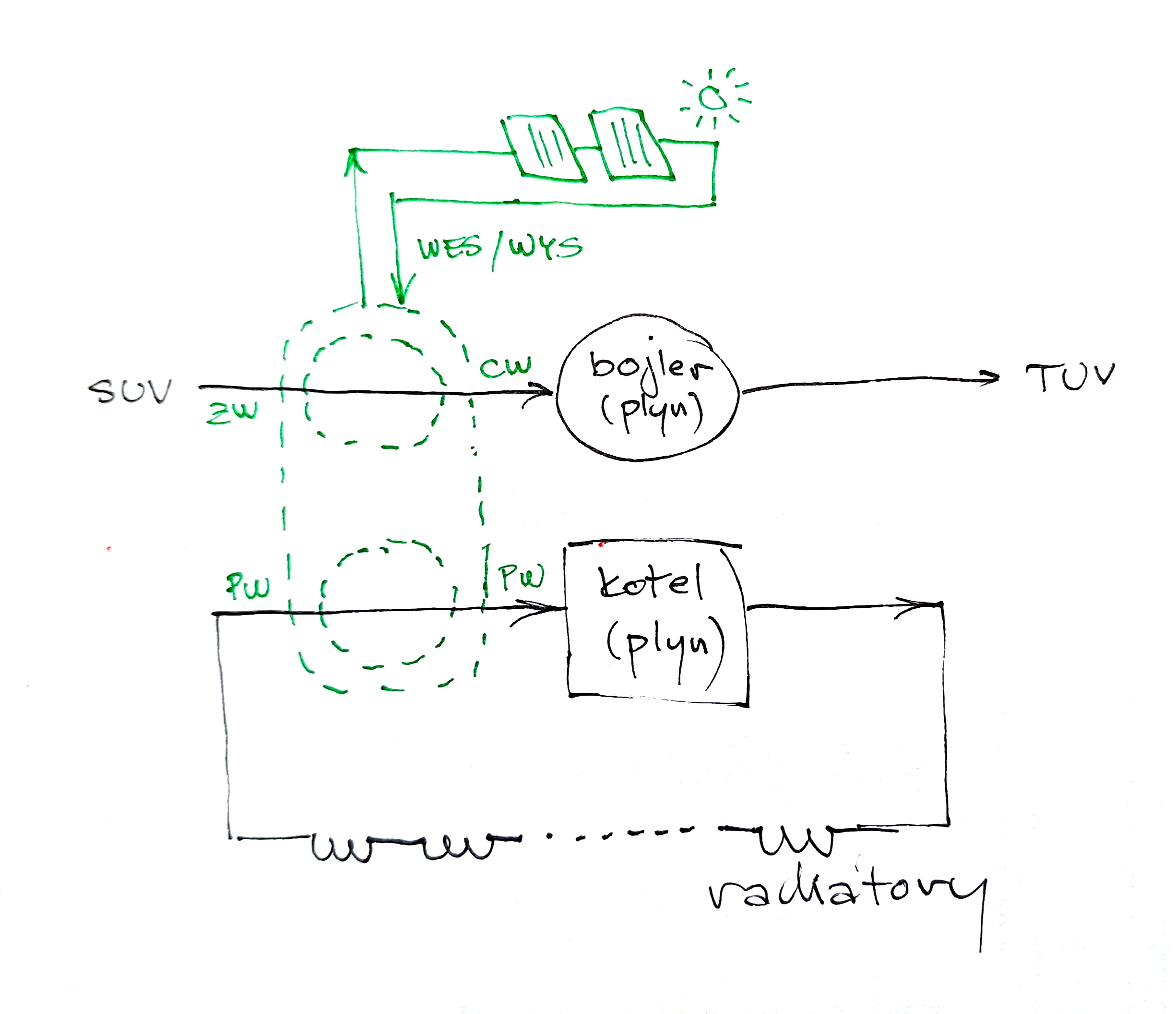 Zelené zkratky = přípojky navrhovaného předehřevu FlexiHeat 350l, jak jsem je já odhadl