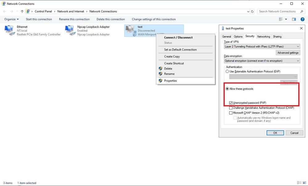 kde u -ConnectionName se uvádí jméno nastaveného připojení v klientu, zde je tedy jméno test. Tj. nejprve se ve VPN klient Windows vytvoří připojení, pak se pustí tahle dávka a dodělá konfigurace.