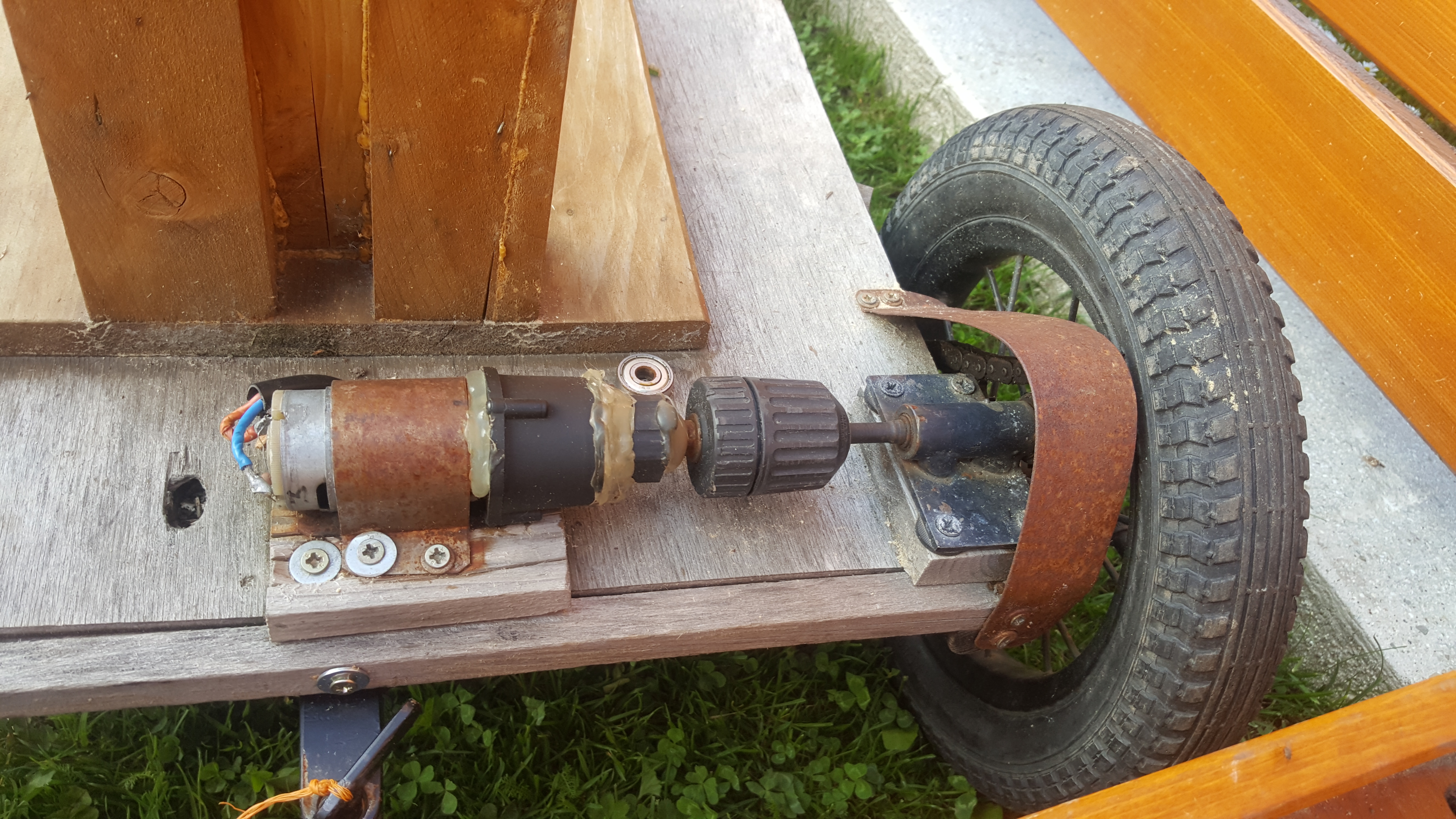 Toto je motorček z akučky 14.4v a beží na 12v baterke, takže mu ešte ku "šťastiu" chýba 2.4v. Je zprevodovaný do pomala 1:2 a poháňa koleso asi 30cm v priemere. Motokára váži asi 20 kg a vozí sa na nej vpohode sj moja 50kg ženuška