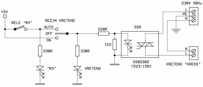 Jako vykonnovy prvek jsem pouzil SSR rele S202S02 (skl.cislo v GME 523-158), ktere spina fazy pro vreteno KRESS. LED 'M3' indikuje stav vretene ze systemu, LEDka VRETENO indikuje skutecny stav vretene. Prepinac rezimu vretene je typu ON-OFF-ON.