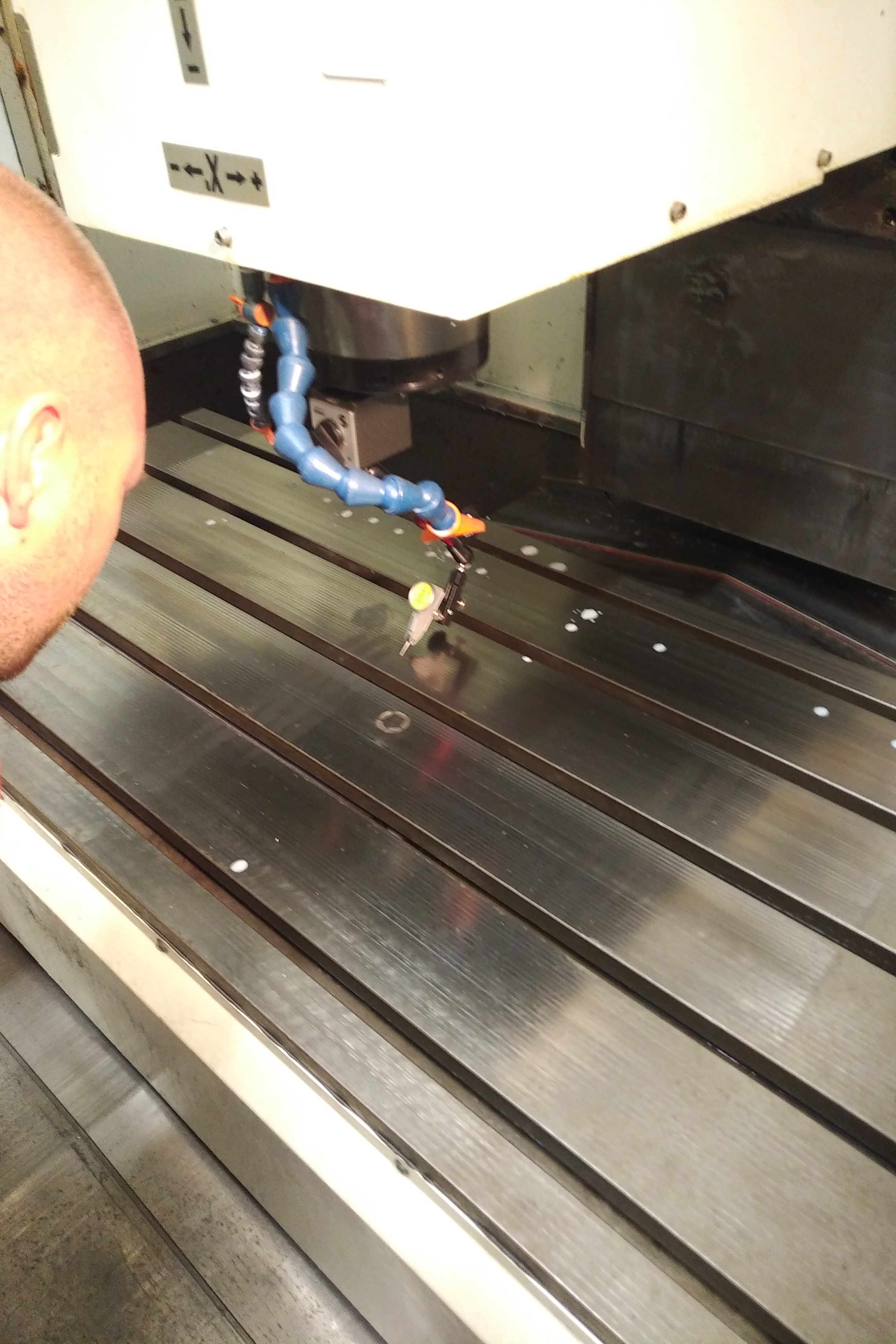 Tak jsem si nasel na stole nejvyssi bod te boule ,dal Z0 a zabral dle rady 0.05mm a prefrezoval. Zitra budu pokracovat. Frezka je vyrovnana na vodovahu + - . Po prvnim prefrezovanim to vypada tak jak je na fotce. Pokud nekdo tady nerekne nejakou radu jak jinak to udelat atd.. Tak budu pokracovat dokud cela plocha co se da prefrezovat nebude preliznuta. Jeste me napadlo ze jsem si mohl v praci pujcit odlehcenou 125mm prumer frezy ale bal jsem se jestli to nebude kontra produktivni.