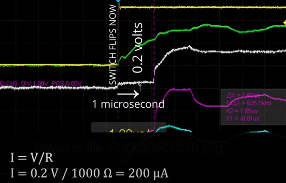 je vidět, že okamžitě po sepnutí teče žárovkou proud 0,2 mA / 0.2 V - ve videu vysvětluje, že jde o kapacitní nabíjení souběžných vodičů - 250mm od sebe (dokládá to v druhé půlce videa, kdy tento nabíjecí průběh proudu v obvodu zůstane, i když vodiče na jedné straně přeruší)
