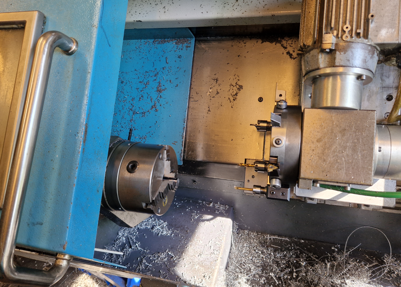 Mám dva identické CNC a v podstatě ze stejných komponent jeden "ruční". Ty soustruhy byly konstruovány na sklíčidlo 125 mm // v nouzi 160 // a nějak se ustálilo, že na jednom je IU a na druhém kleština nebo pneusklíčidlo na serie. Má to točný průměr 180 délku 500. Průchod vřetenem 52. Motor 2,2 kW 2800 ot // CNC // a 2,2 kW 1400 ot // manual //. Mám takový jednotný systém sklíčidel a upínačů nástrojů.