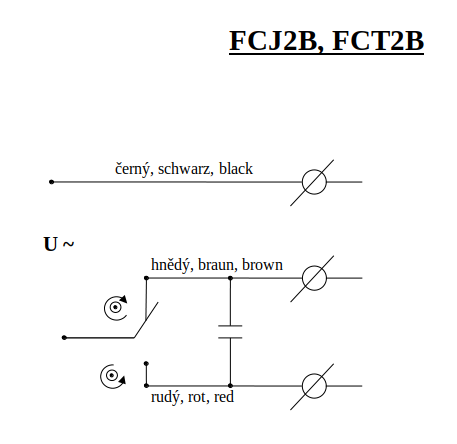 Do motorku vedou 3 dráty - černý (ten vedl od kondenzátoru) a dva červené. Černý proti oběma červeným po 50 Ω, červené mezi sebou 100 Ω. Co mi to říká? Samozřejmě kromě toho, že neumím číst ve schématech.