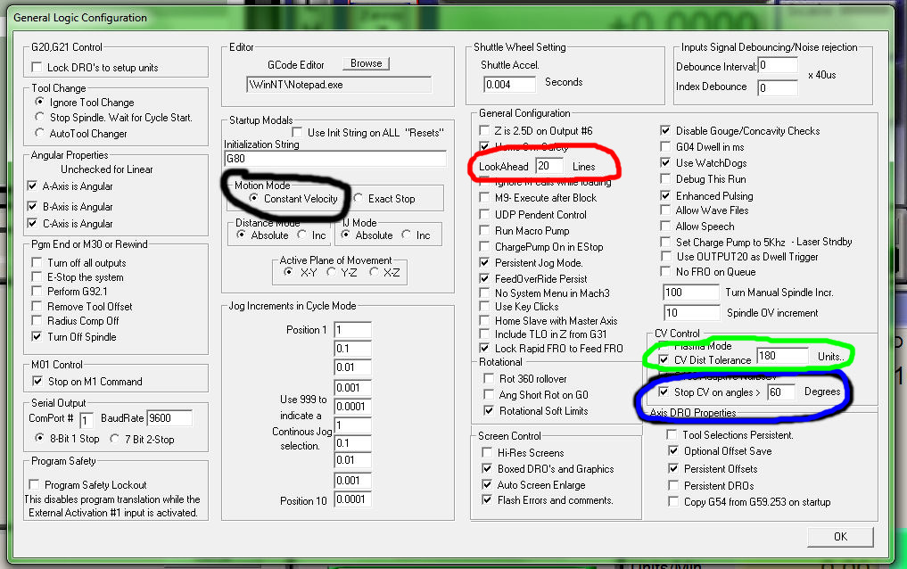 "modrý" parametr je "limitní úhel vektoru" který určuje, při jakém prostorovém úhlu (odchylce od původního směru) dvou po sobě jdoucích vektorů (vektor je směr pohybu) bude brzděno a následně akcelerováno. pokusím se popsat to na příkladu: máme dráhu v rovině XY která tvoří čtverec, při nastavení např. 70° bude řídící systém v koutech brzdit na nulu a opět akcelerovat. pokud by byl v rovině XY pravidelný šestiúhelník tak by systém neprojel koutem, jinak řečeno "zkrátil by si cestu" a místo ostrého koutu by tam byl rádius, jehož velikost by závisela na více faktorech, hlavně však na aktuální rychlosti posuvu (F - feed). "zelený" parametr určuje právě tu míru nepřesnosti o které jsem psal výše. pokud nastavím CV D T na 3 units (mm) bude dráha přesná až do vzdálenosti 3mm od koncového bodu. tam se začne odklánět a plynule navazovat na další dráhu, to se stane až 3mm za koncovým bodem první dráhy. (toto celé samozřejmě platí i pro pohyb ve 3D). takže zelený parametr určuje míru nepřesnosti sledování matematické dráhy nástroje. kombinací těchto dvou parametrů a akcelerace se dá naladit frézka tak, že jsou její pohyby "měkké", chce to ale trochu trpělivosti! pro rychlosti pod F1000 a při současné akceleraci kolem 200 není potřeba parametr CV D T ani zapínat - moje zkušenost. parametry je třeba nejen nastavit, ale i "zafajfkovat" a uložit [OK]
