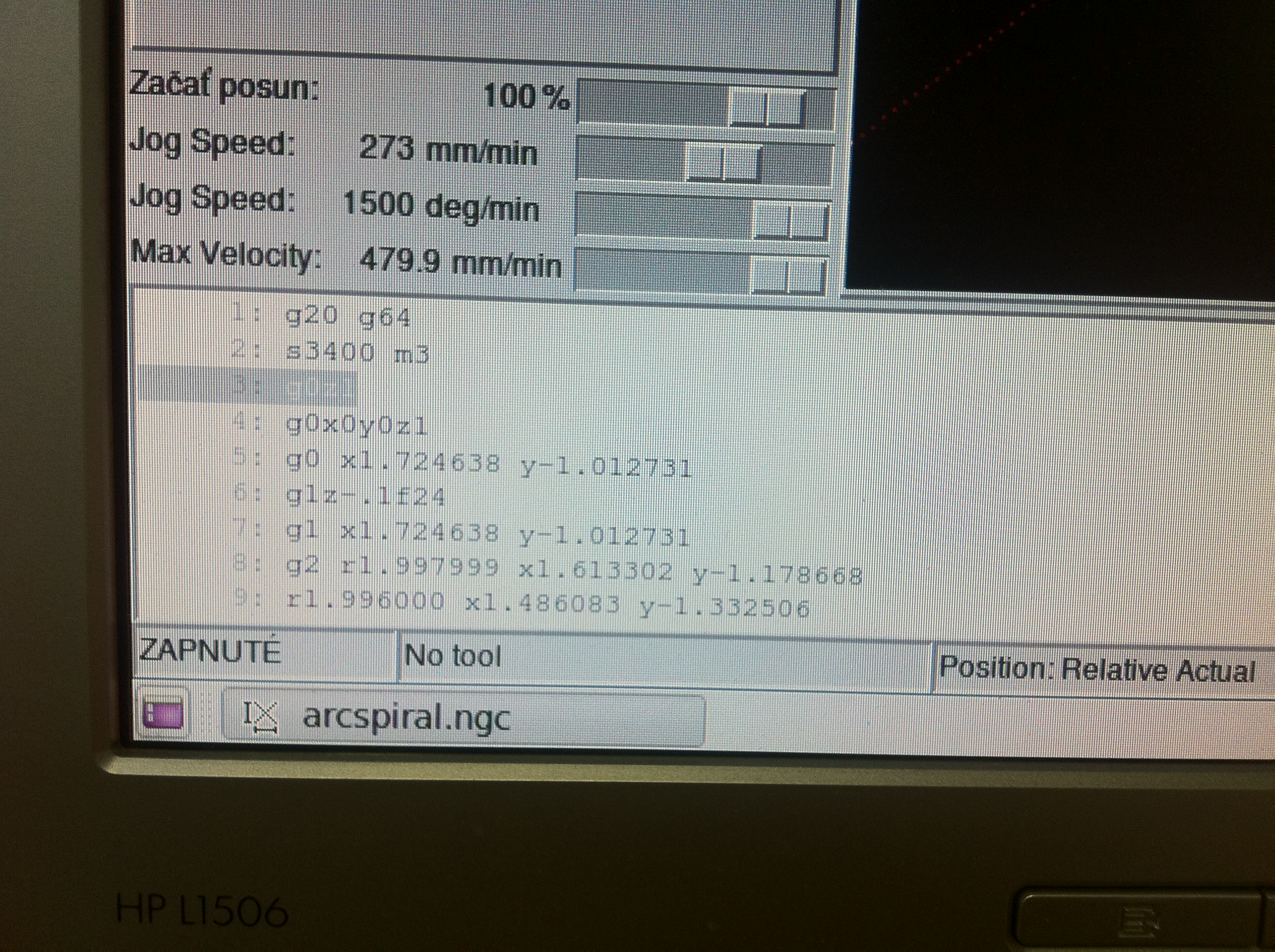 Aspon sem prikladam foto z monitora, je to zaber z momentu, ked som otvoril ,,nevhodny,, subor, nastavil pre vsetky osi home a dal play...pak to odmietlo spolupracovat a zamrzol..ide to zobudit stlacenim funkcie stop, no nic ine s tym robit nemozem..ziadne hlasky nevypisuje..